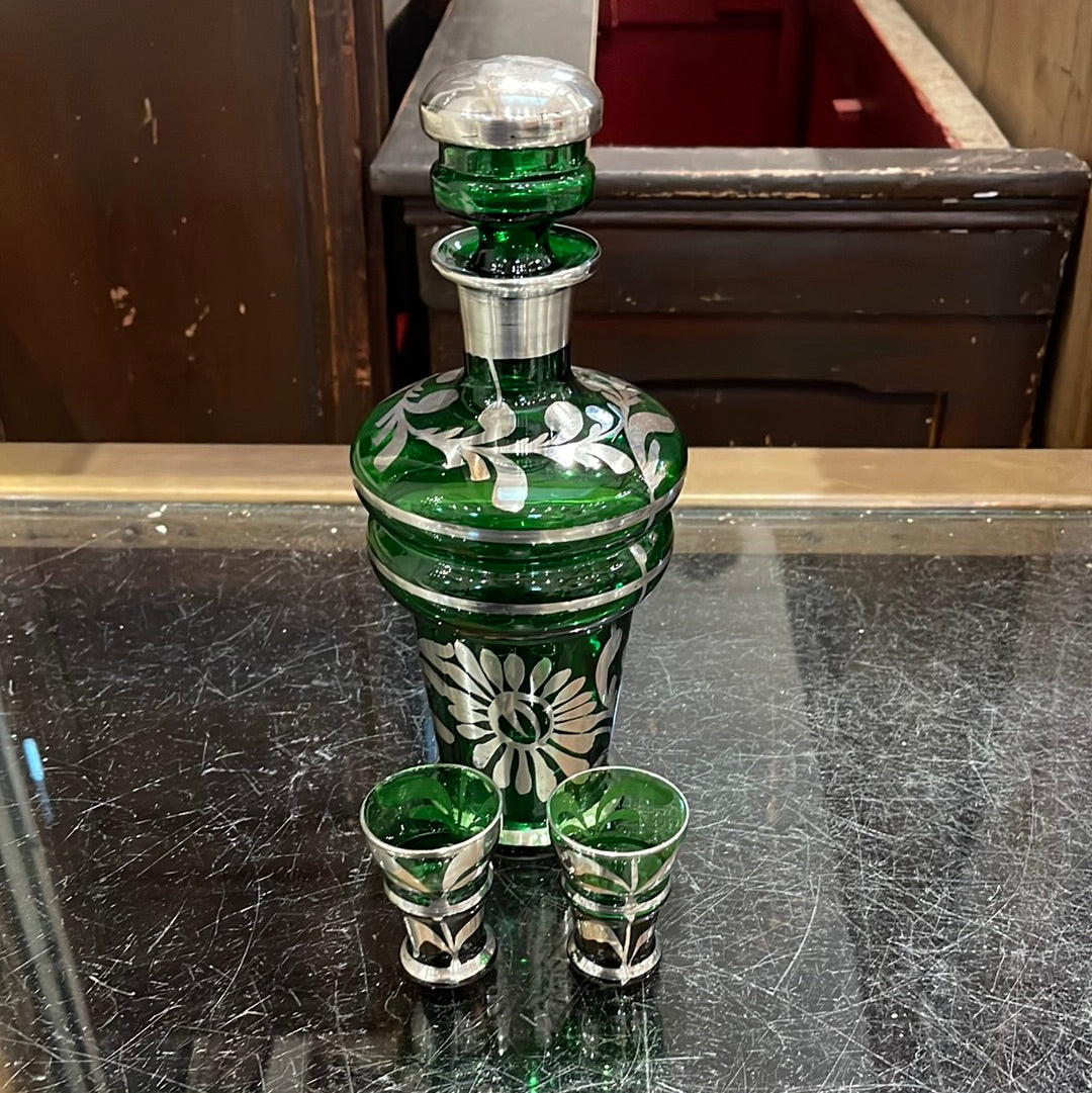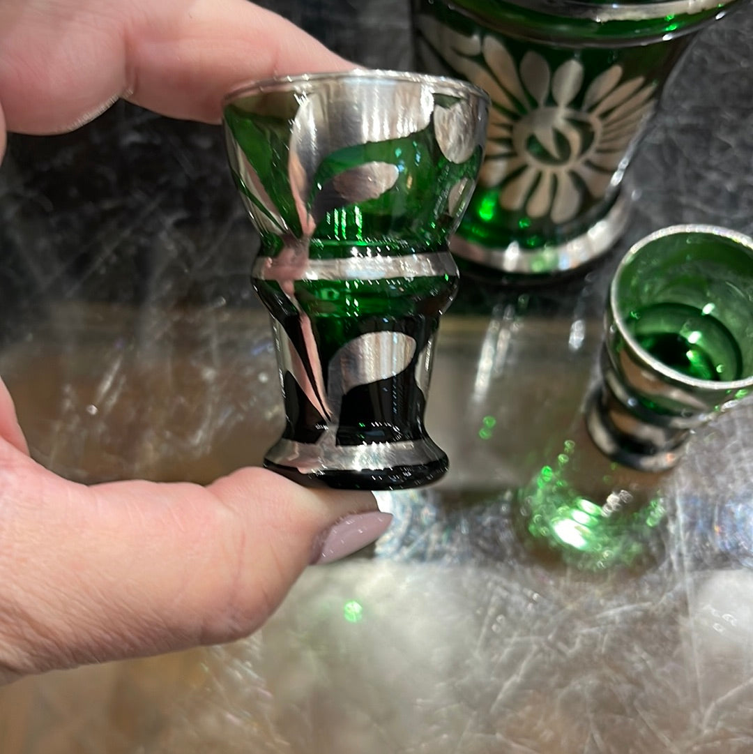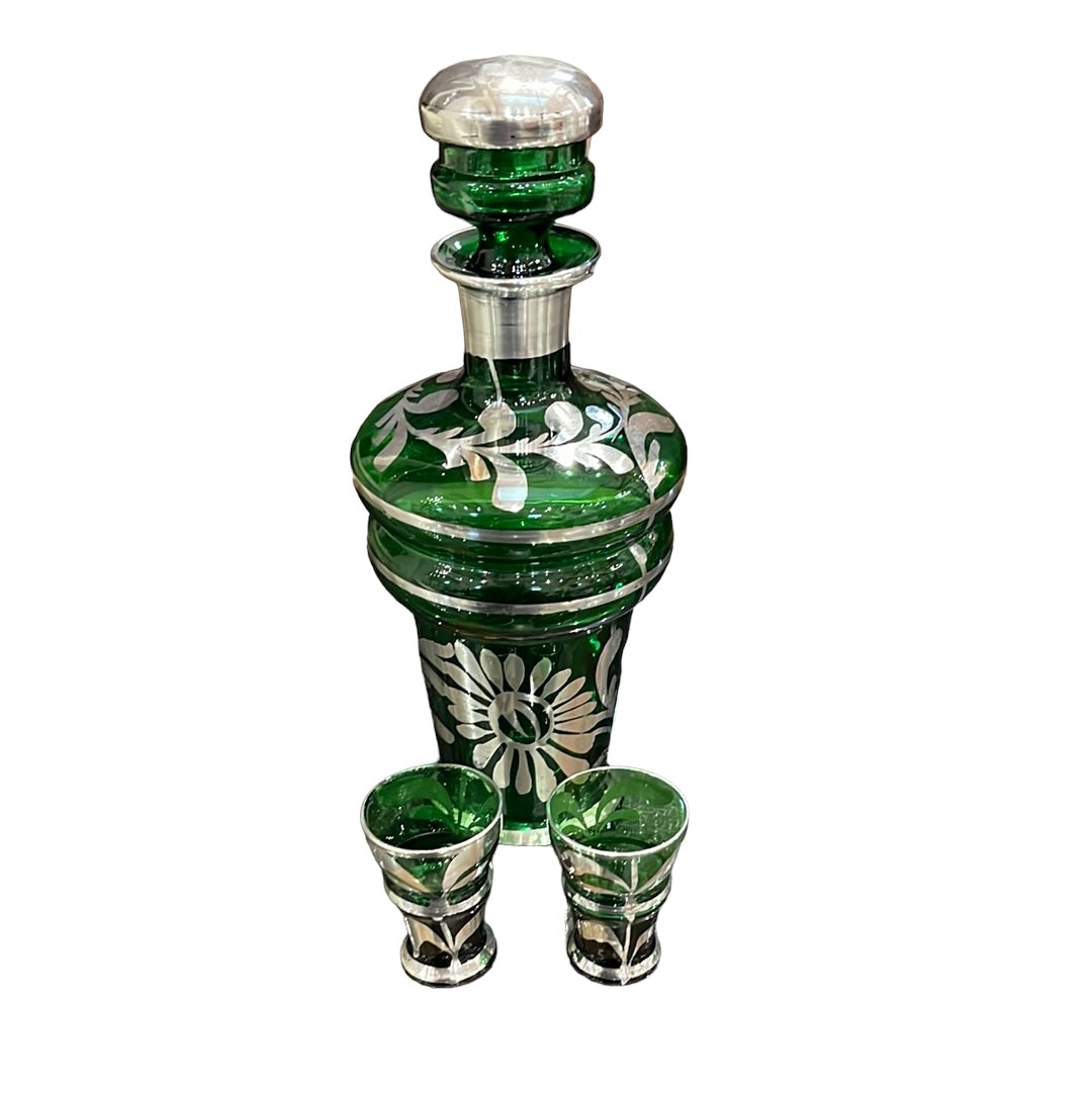 Elevate your drinking experience with our Glass Decanter Set. Made from green and silver Bohemian glass, this set includes a decanter and 2 matching shot glasses. Add a touch of sophistication to your home bar or impress guests at your next gathering. Cheers to style and quality!