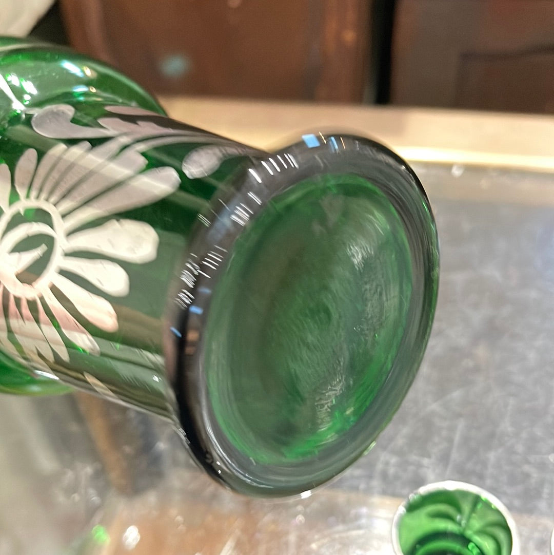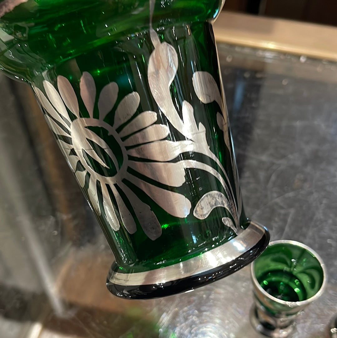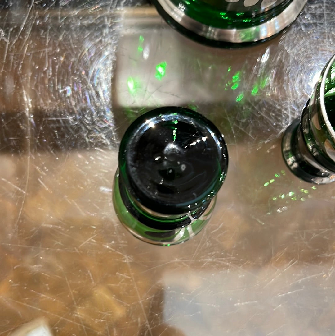 Elevate your drinking experience with our Glass Decanter Set. Made from green and silver Bohemian glass, this set includes a decanter and 2 matching shot glasses. Add a touch of sophistication to your home bar or impress guests at your next gathering. Cheers to style and quality!