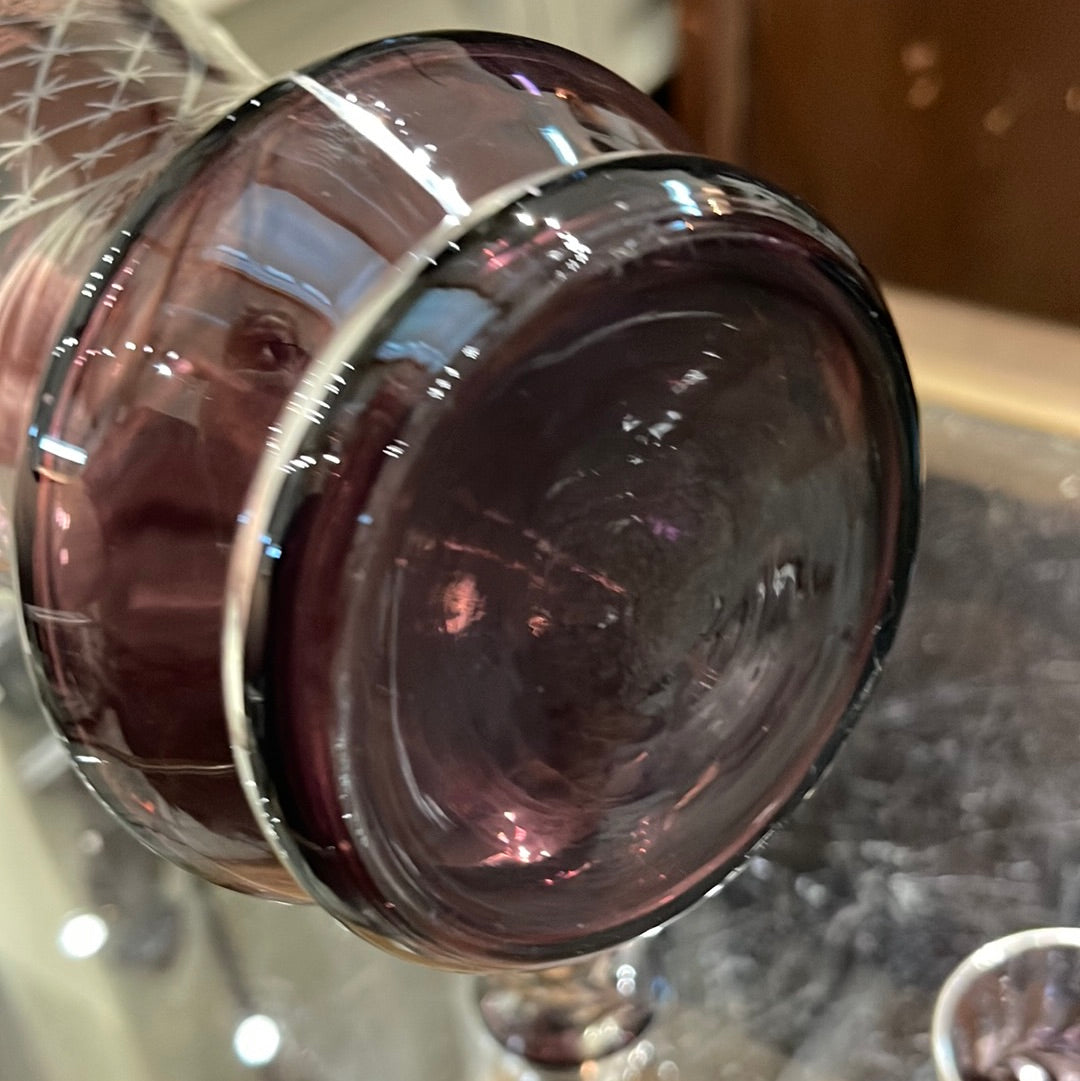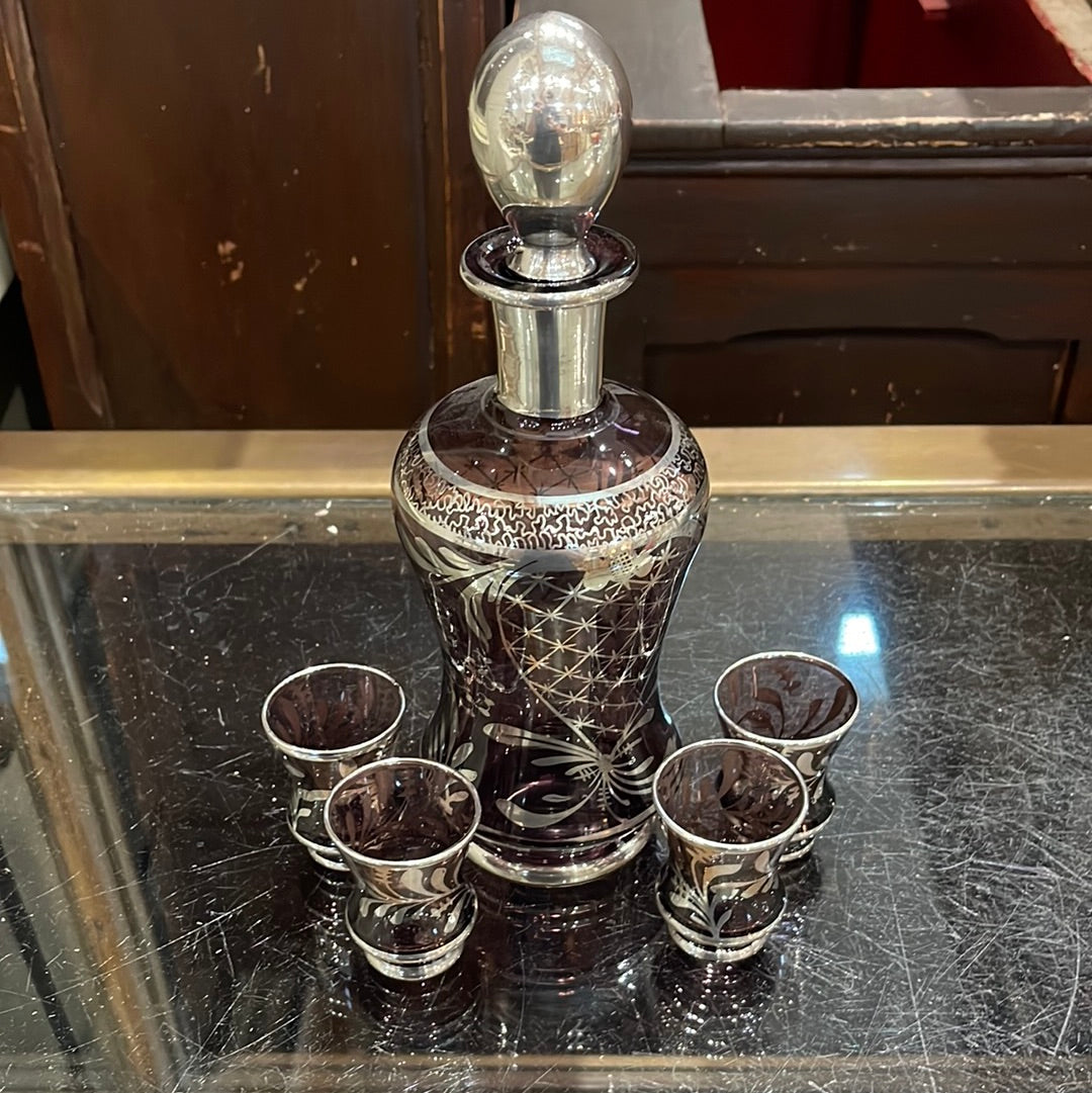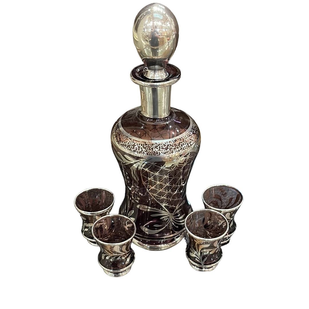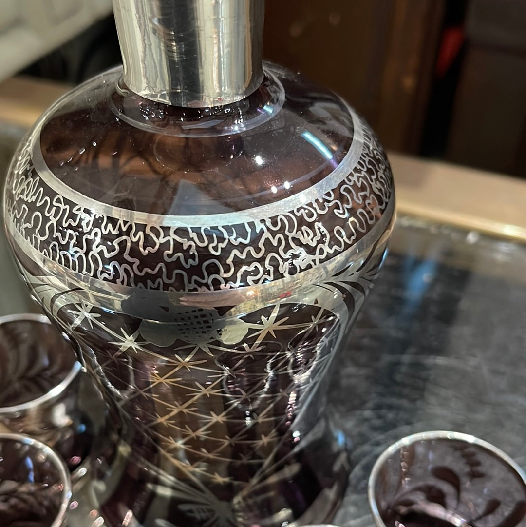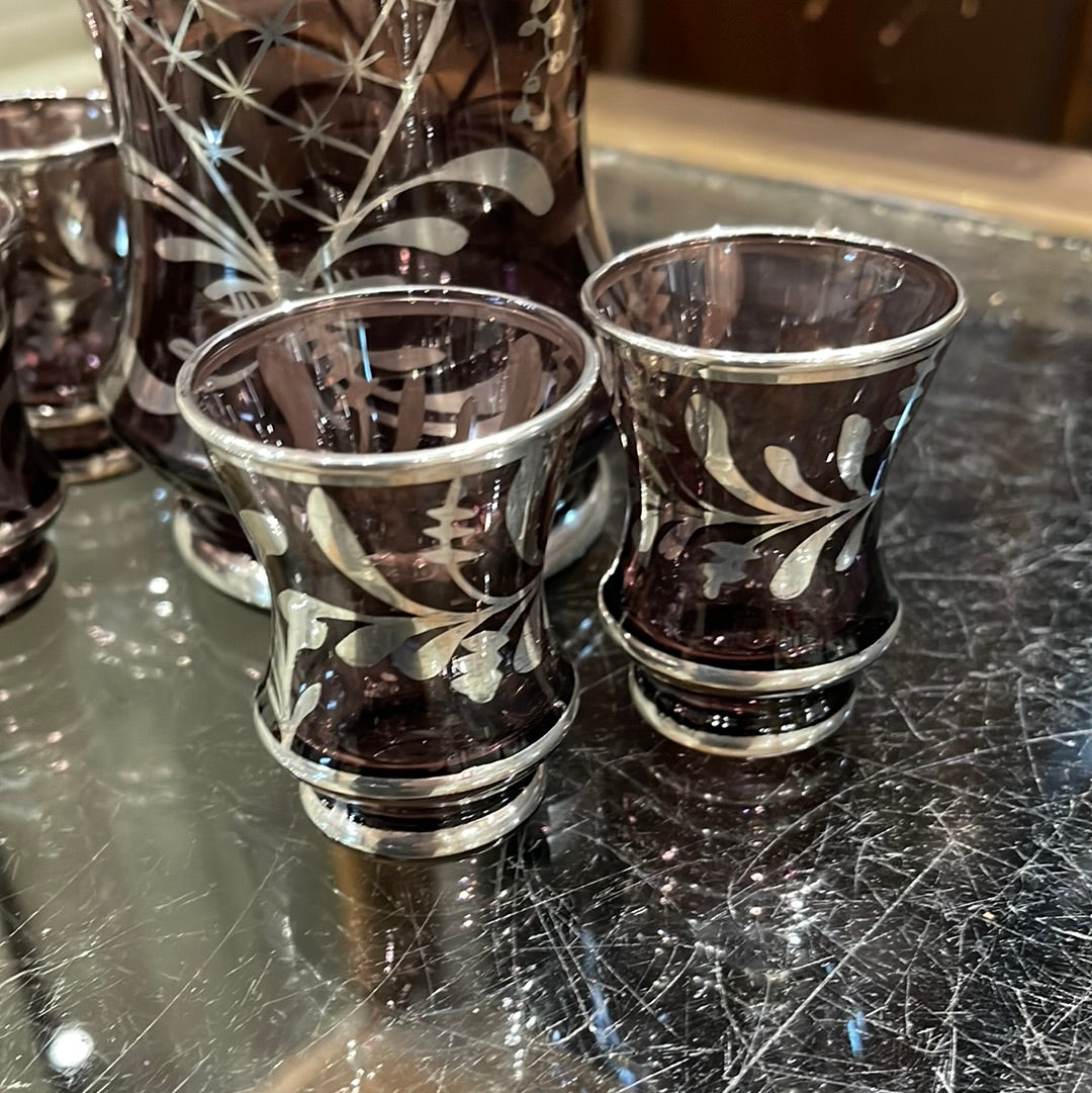 Purple and Silver Glass Decanter Set with 4 matching glasses.