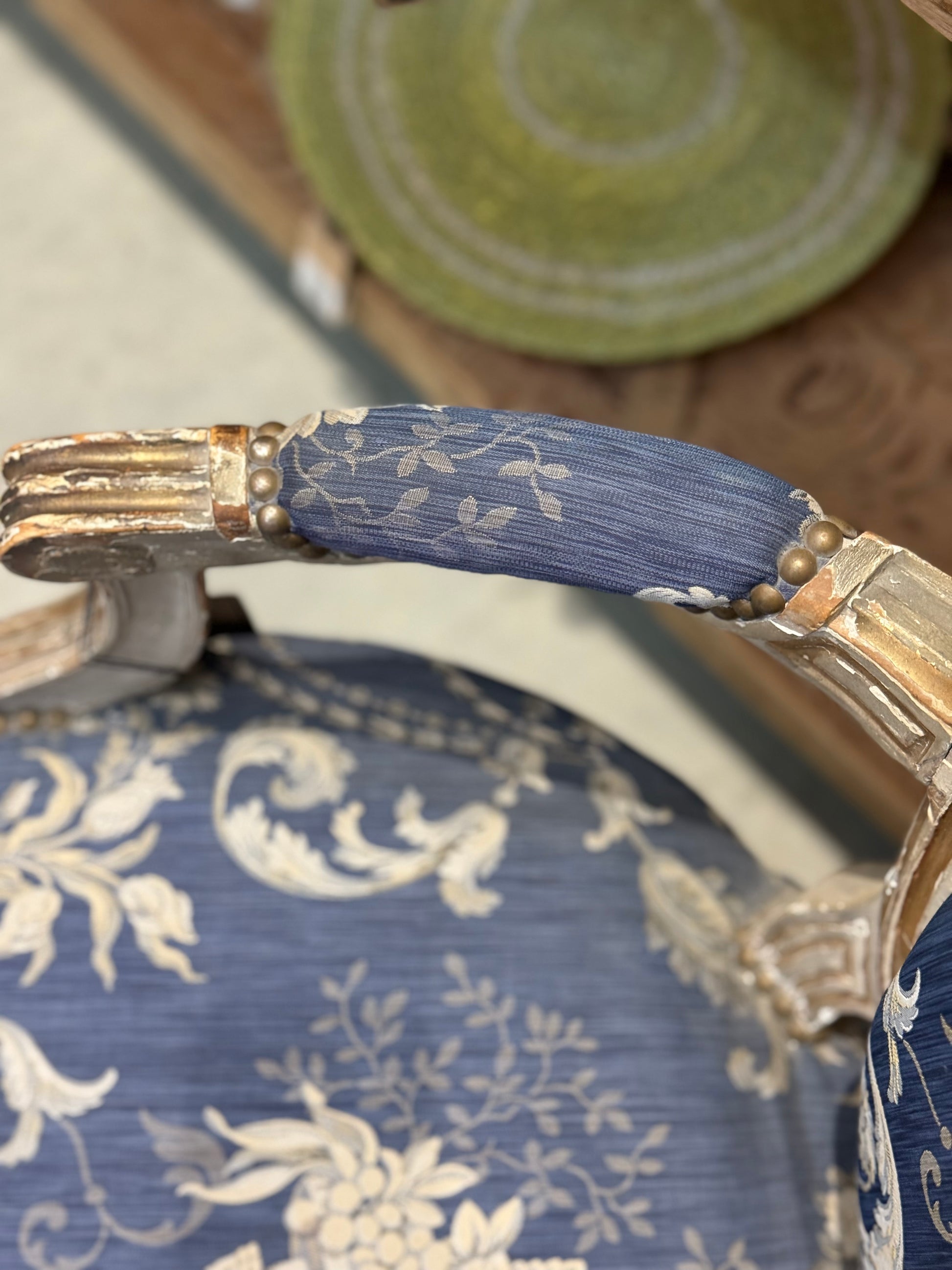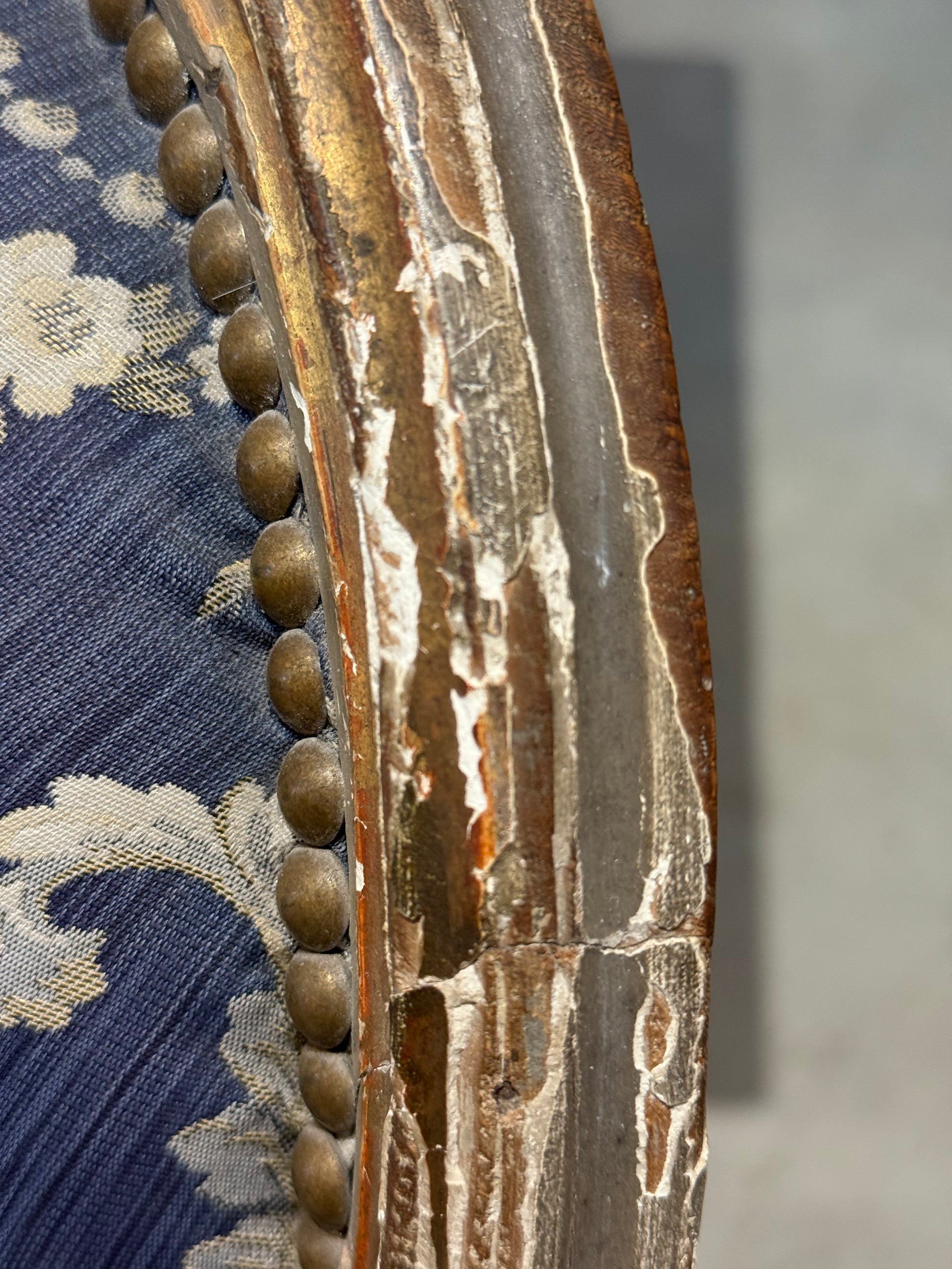 A refined French Louis XVI style armchair, beautifully detailed with a carved oval back, fluted legs, and classical lines. The frame shows its original painted and gilt finish with desirable age-appropriate wear, enhancing its authentic patina.