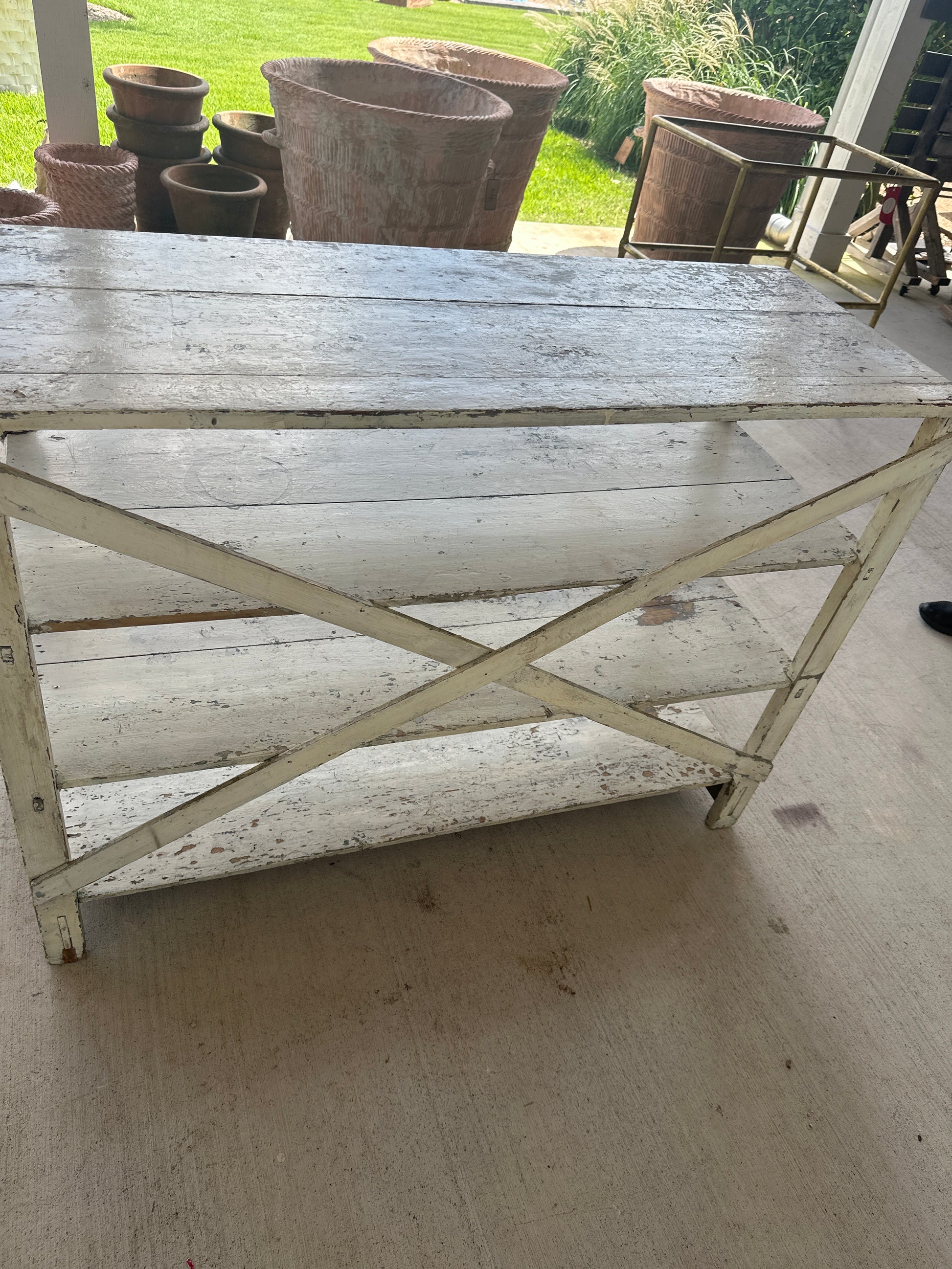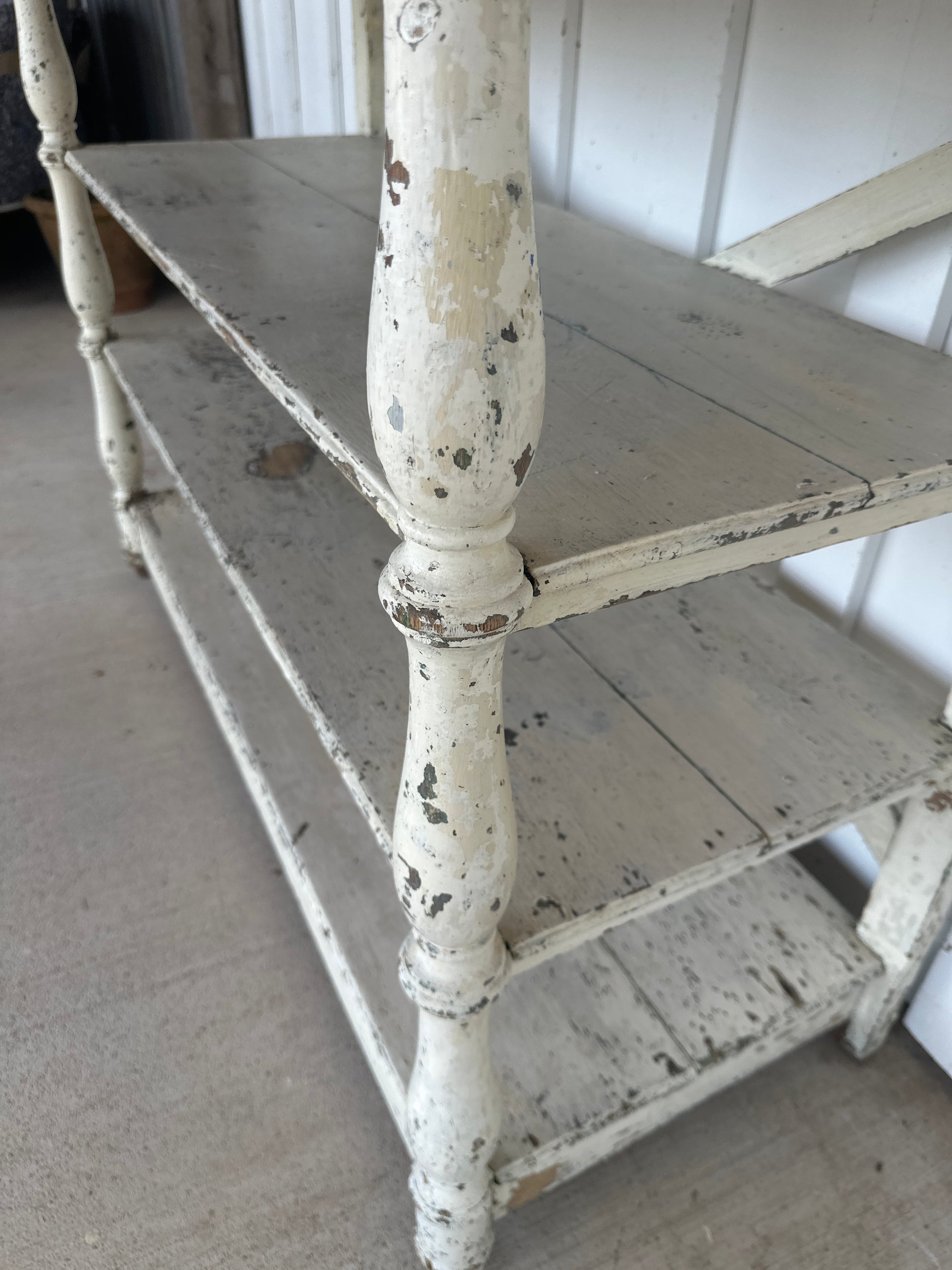 A rustic French painted shelf with four open tiers and turned supports, finished in a distressed white patina that shows layers of age and character. Practical and versatile, it works beautifully for storage or display in a kitchen, pantry, bath, or shop setting.