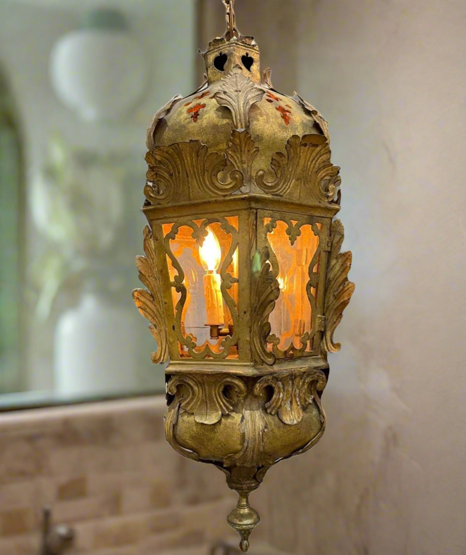 These are not your typical English knock-offs! Lovely Italian Venetian lantern, a polychrome iron lacquered iron sheet with a hexagonal lantern in embossed iron sheet adorned with scrolling foliage along the sides; they have on each side small windows in clear glass (1 missing). The shipping may require an additional 2 to 3 handling weeks to the destination of your choice.