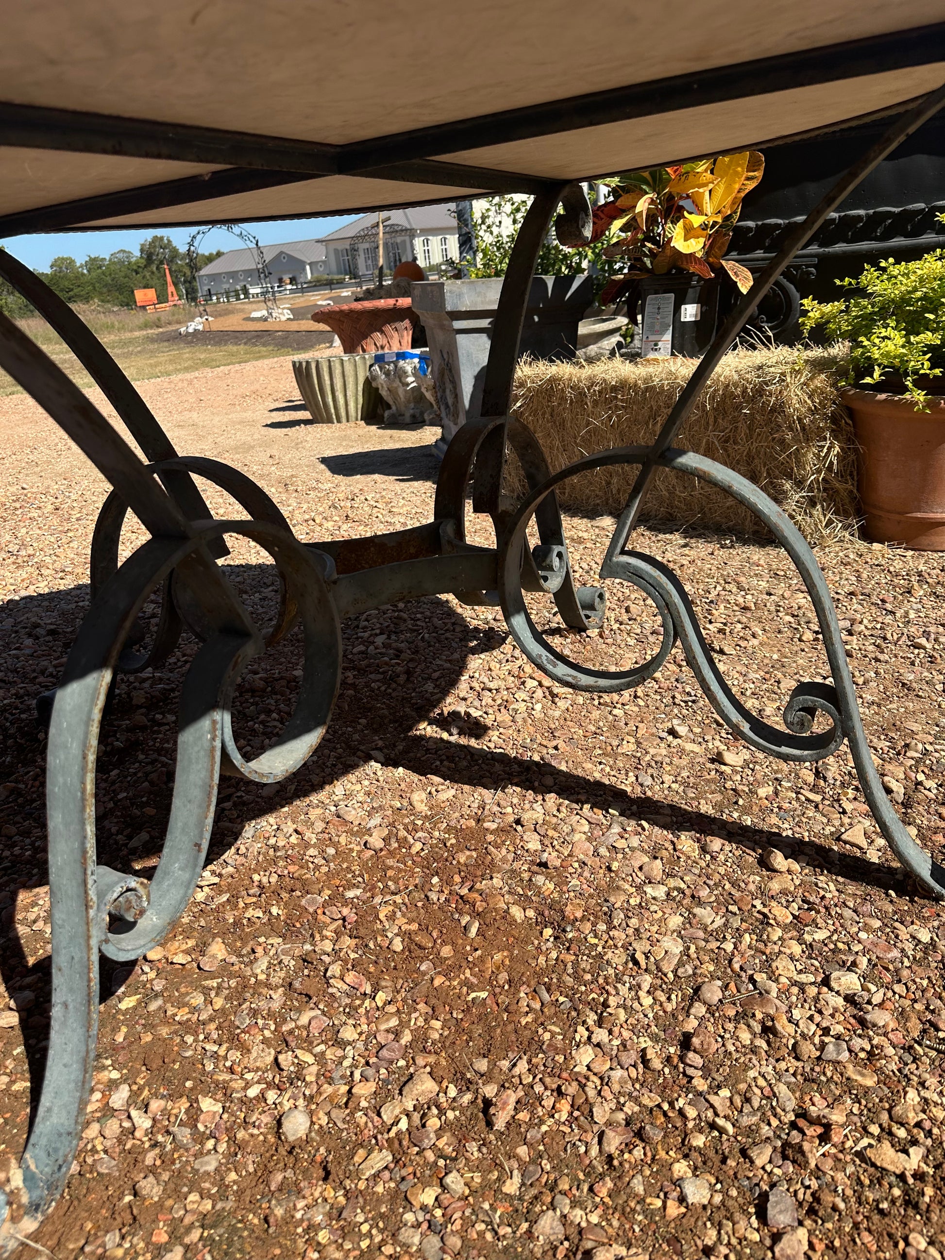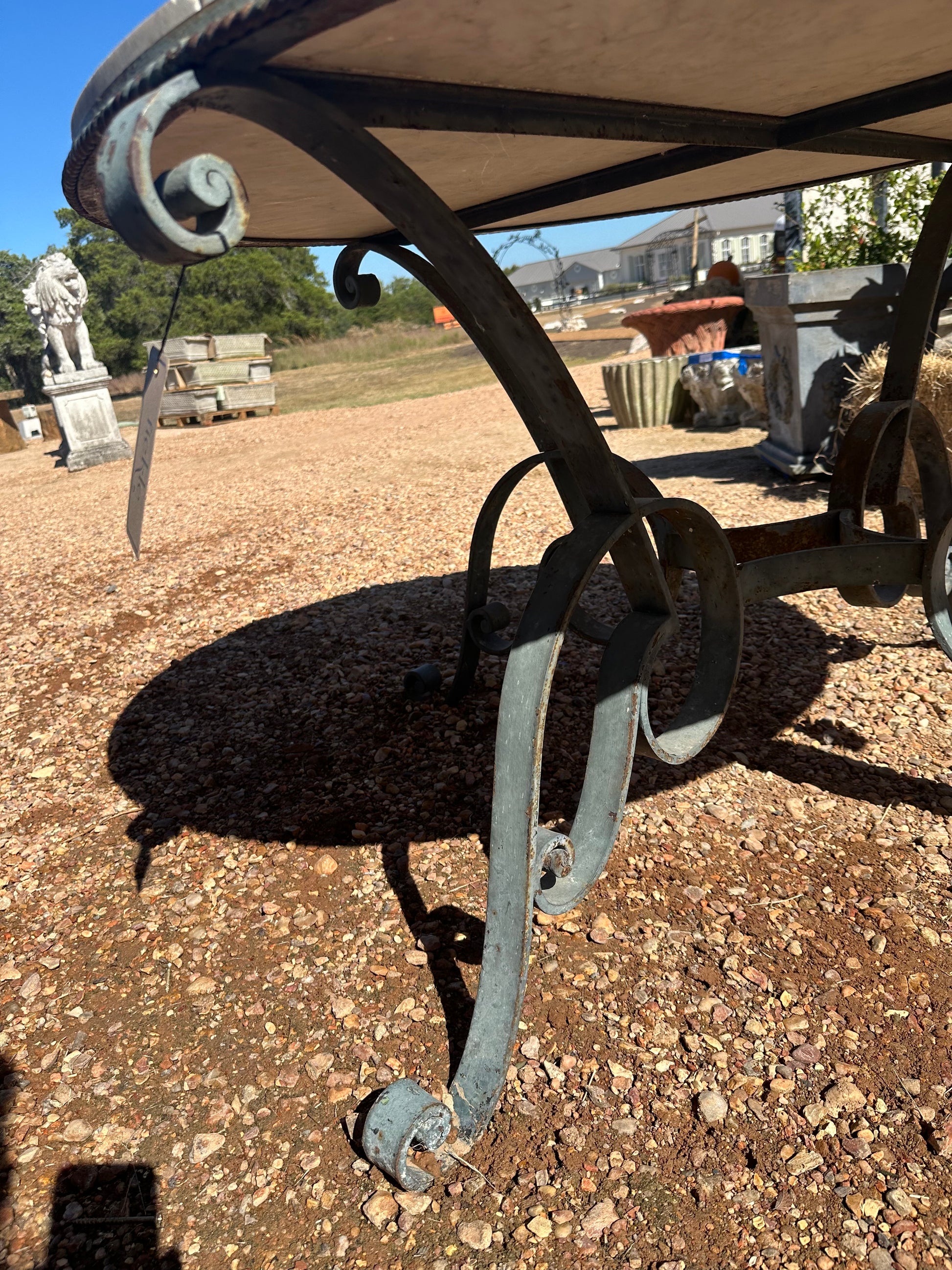 Elegant and versatile, this round table features a marble top formed from four precisely cut sections, creating a unique and beautiful surface with natural veining. The sturdy wrought iron base showcases graceful scrollwork and a weathered patina, adding timeless character. Perfect for indoor or outdoor use, it makes a striking dining table, garden centerpiece, or display surface.