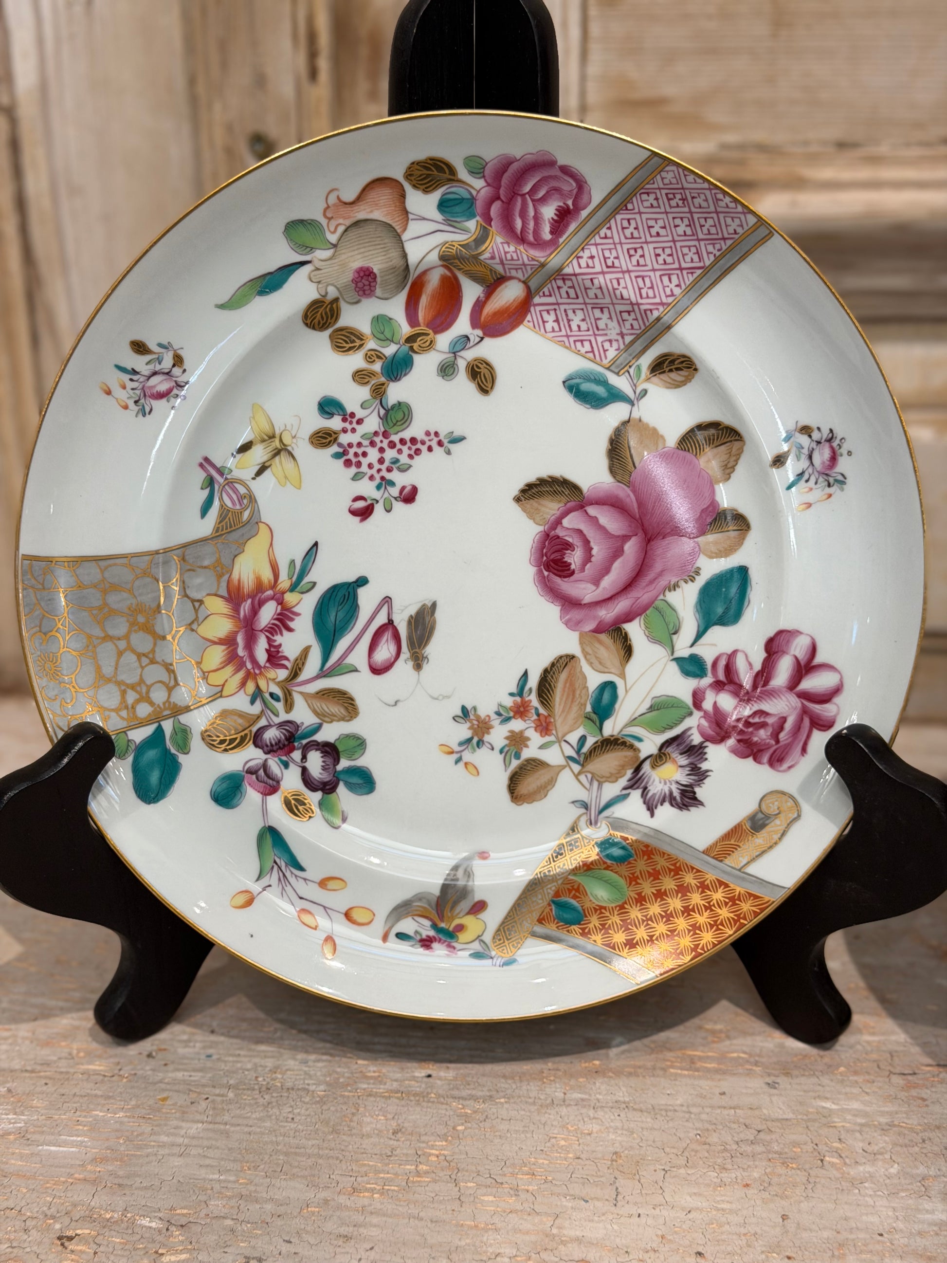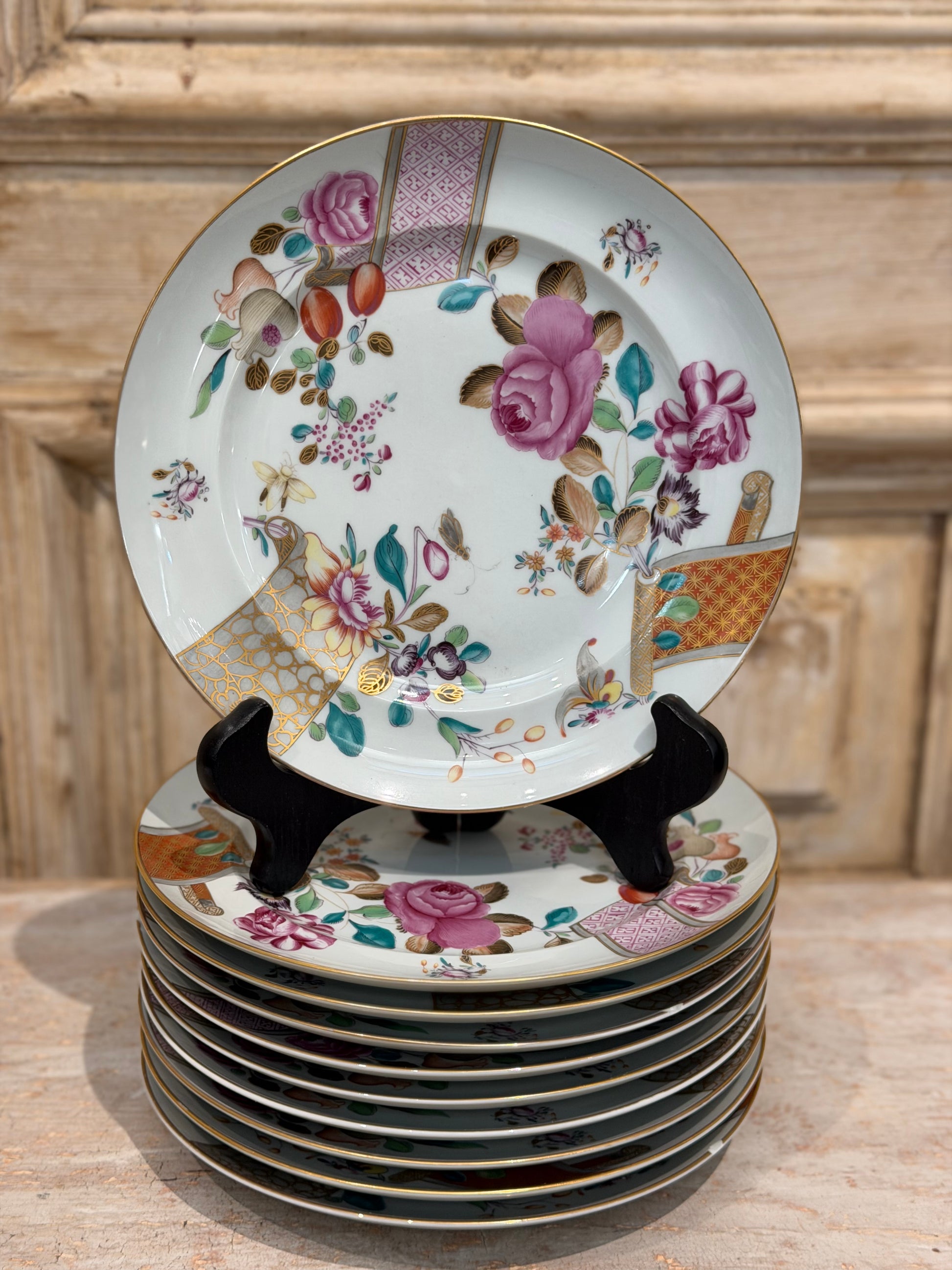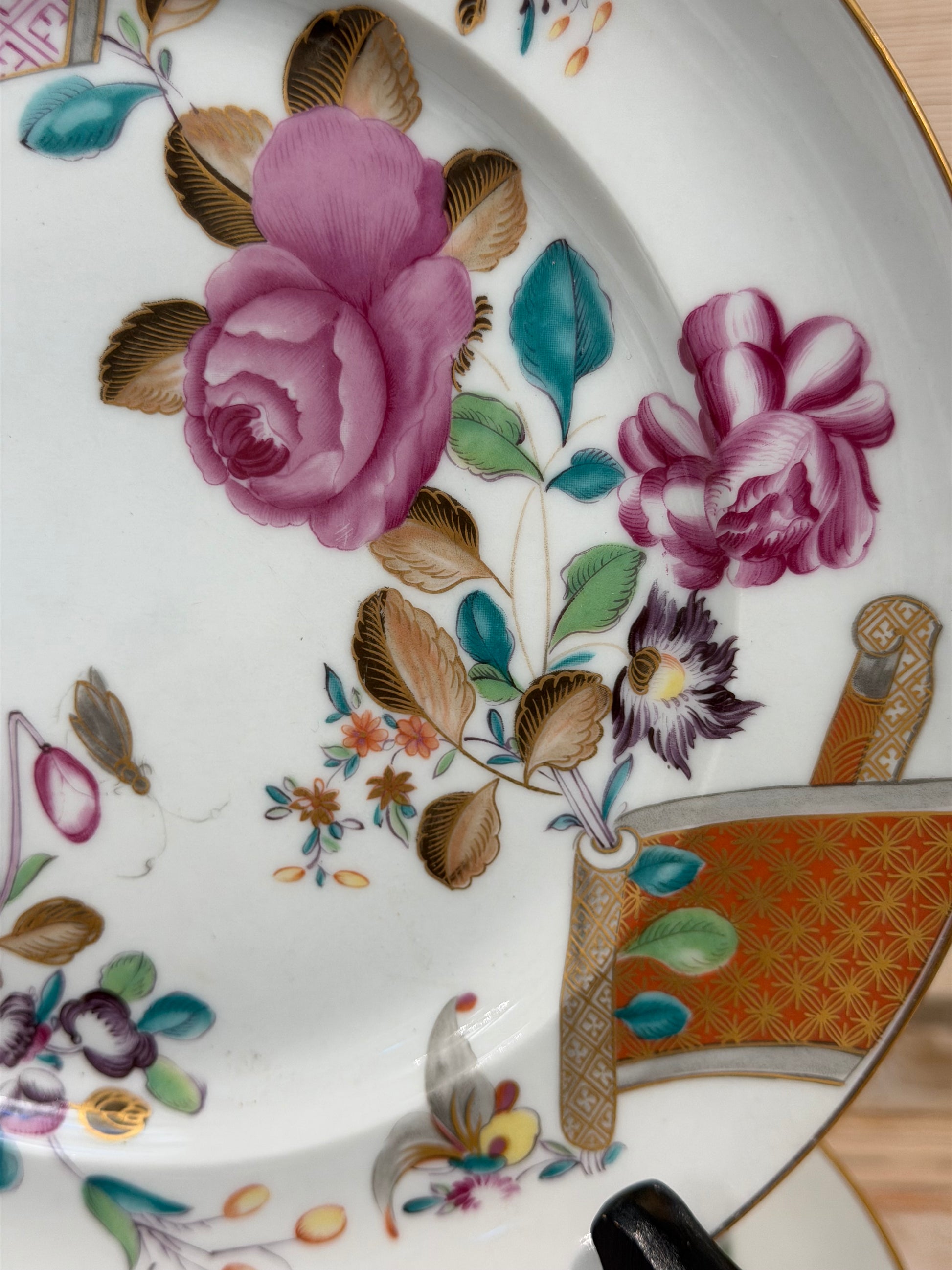 This pattern is celebrated for its soft celadon green ground, hand-painted florals in rose, plum, and teal, and refined gilded accents. The palette is sophisticated yet warm, lending itself equally to formal dining rooms, English country house interiors, and layered tablescapes with white ironstone.