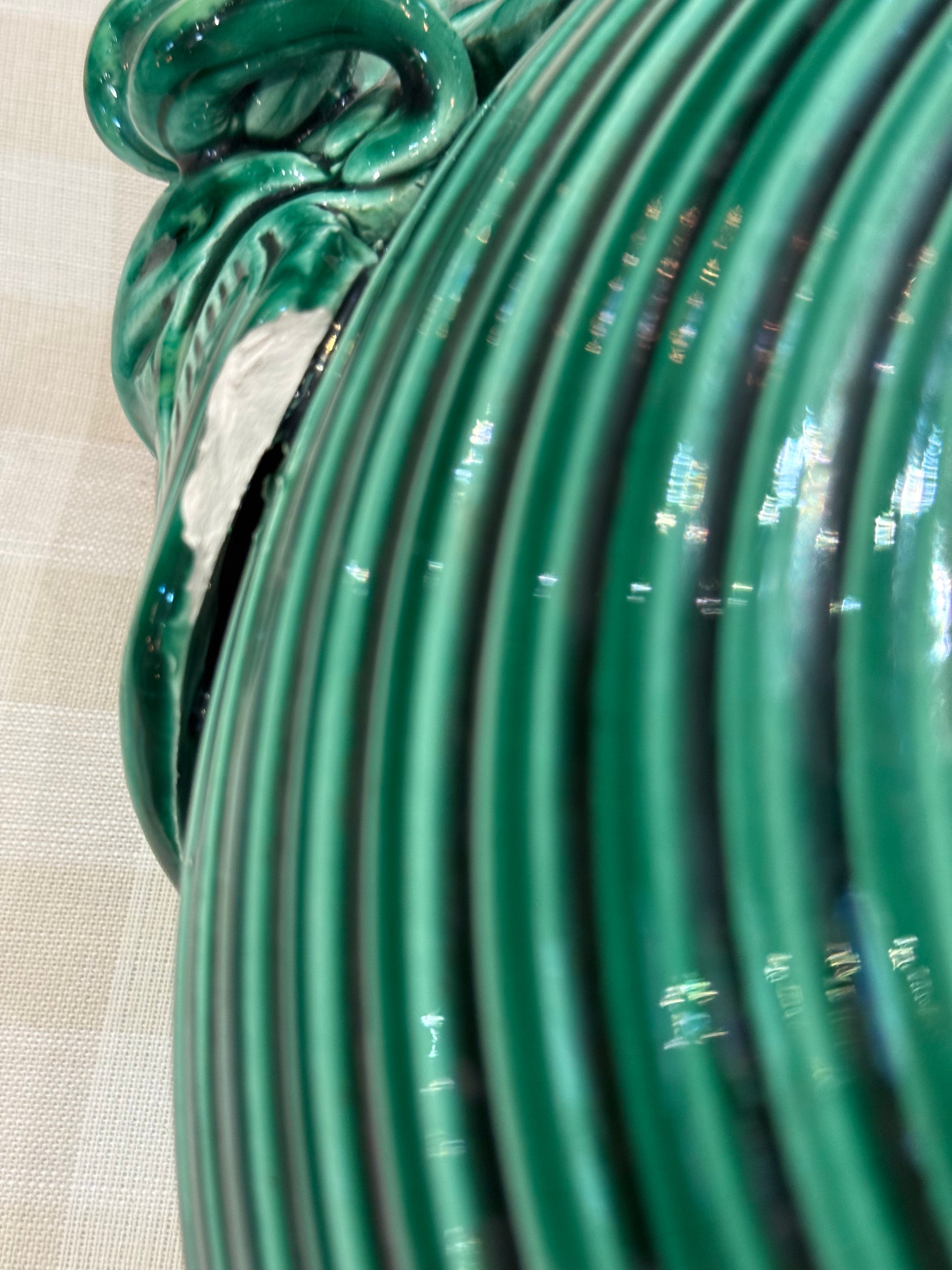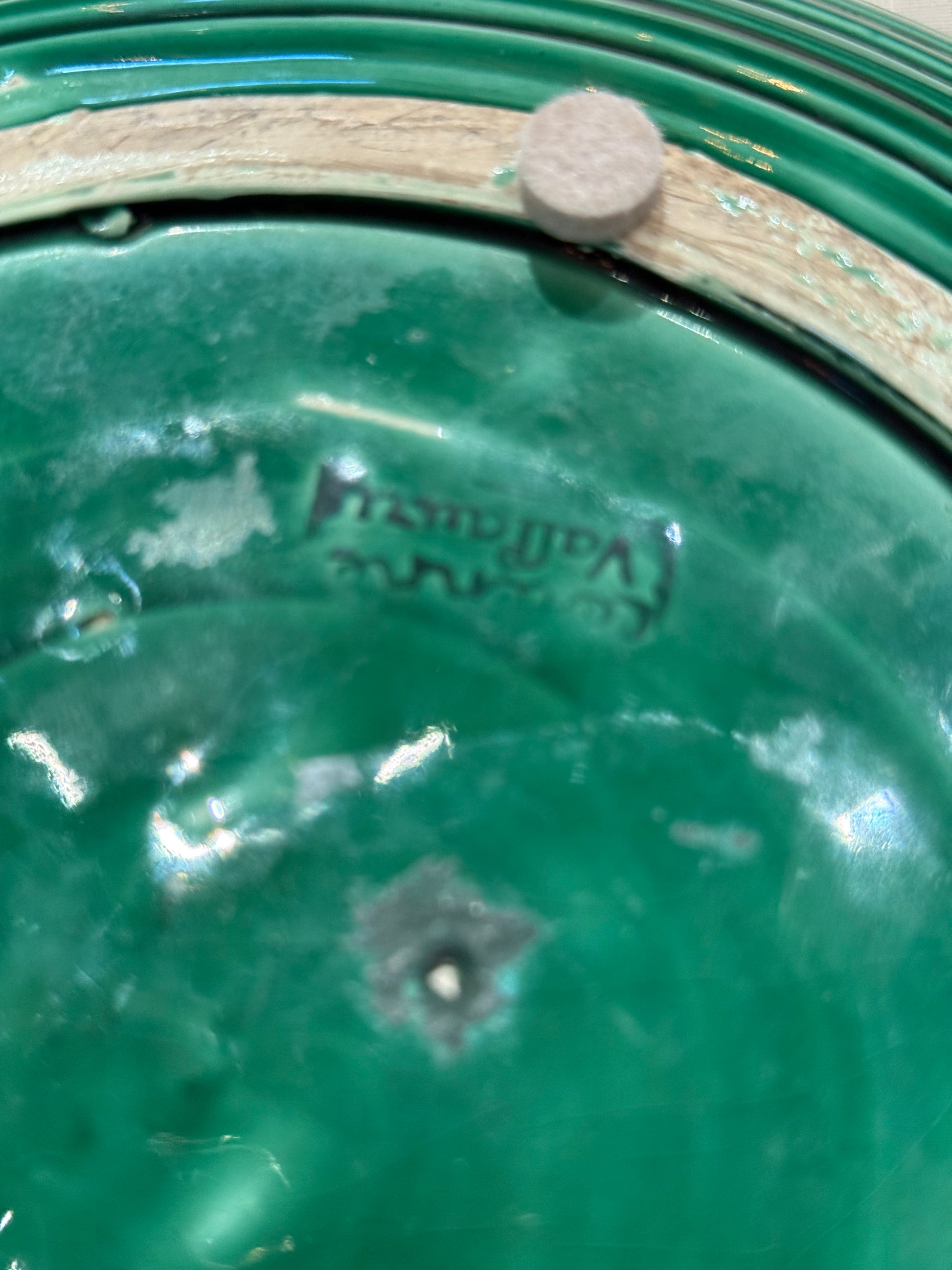 Colorful majolica-style ceramic dish by French artist Emile Tessier (1887–1971). The piece features a deep green spiral-glazed base with applied fruit clusters — including pears and grapes — in vivid hand-painted tones. Tessier’s ceramics are celebrated for their whimsical yet skillful craftsmanship, blending natural motifs with rustic French artistry.