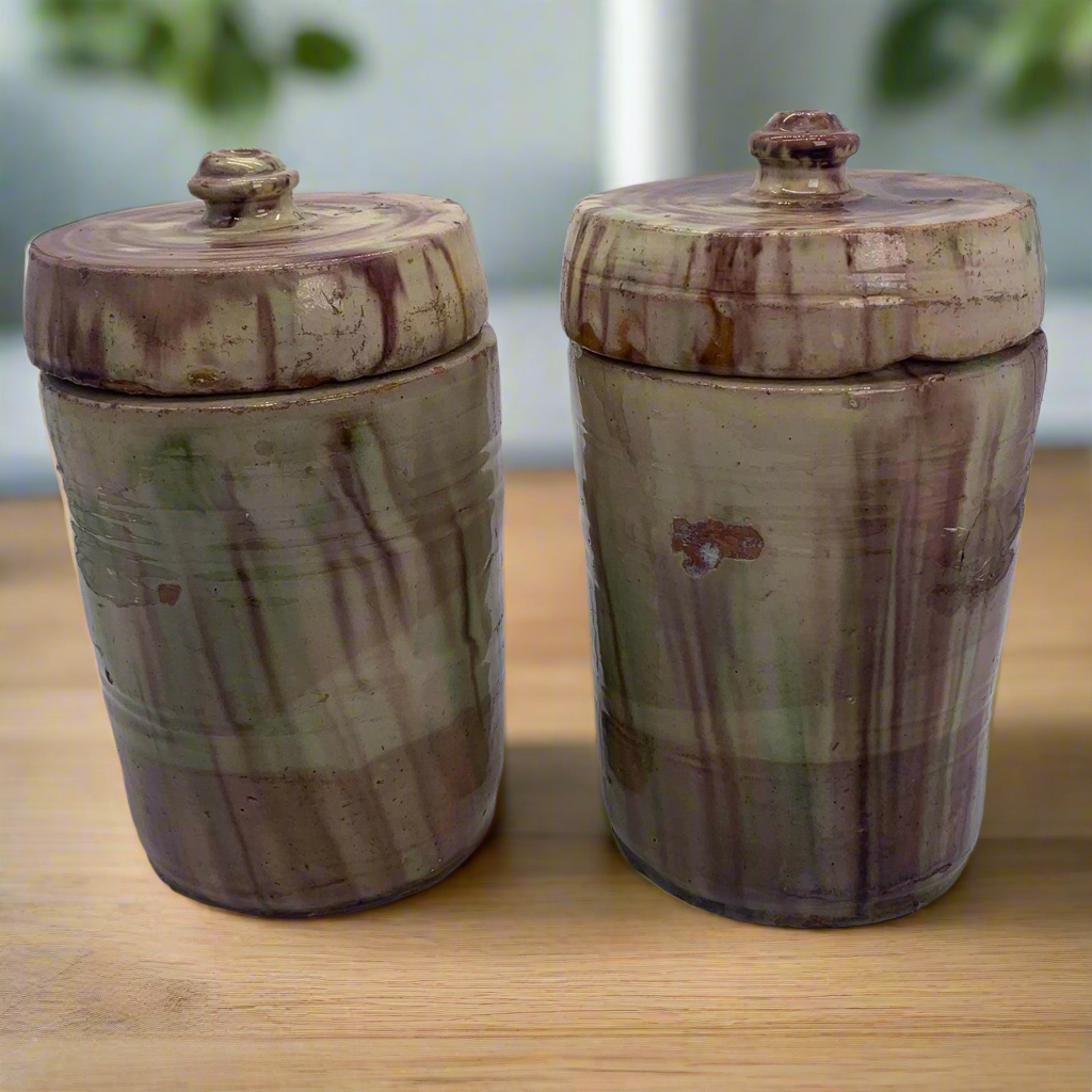 Beautiful ceramic lidded spice jars dating back to the early 20th century. A very unique combination of colors paired with their size make them great accent pieces.