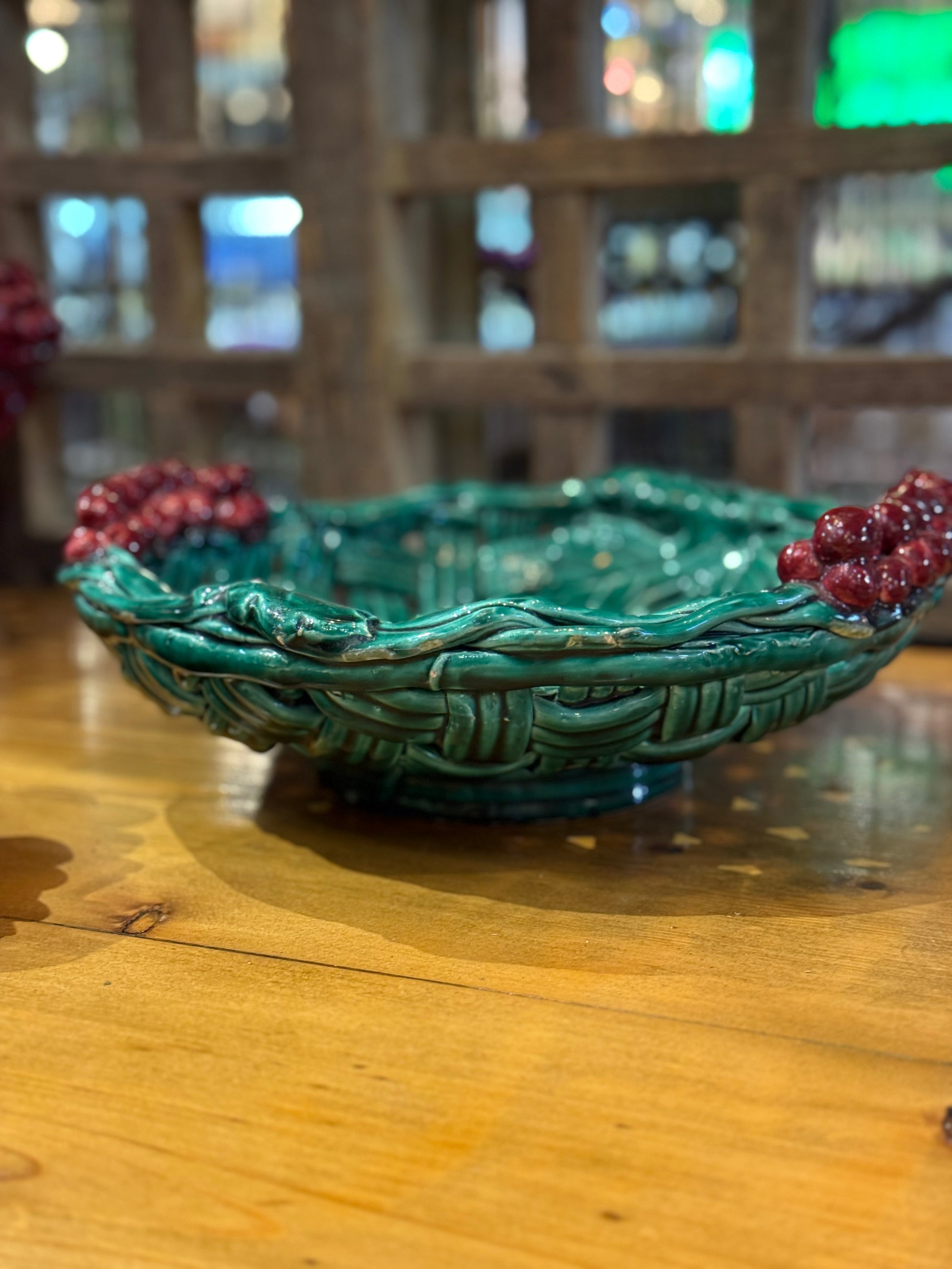 Vibrant ceramic basket plate by French artist Emile Tessier (1887–1971), featuring a woven green majolica-style surface with applied grape clusters and leafy vines. Tessier’s work is celebrated for its playful yet skillful craftsmanship, blending natural motifs with decorative charm.