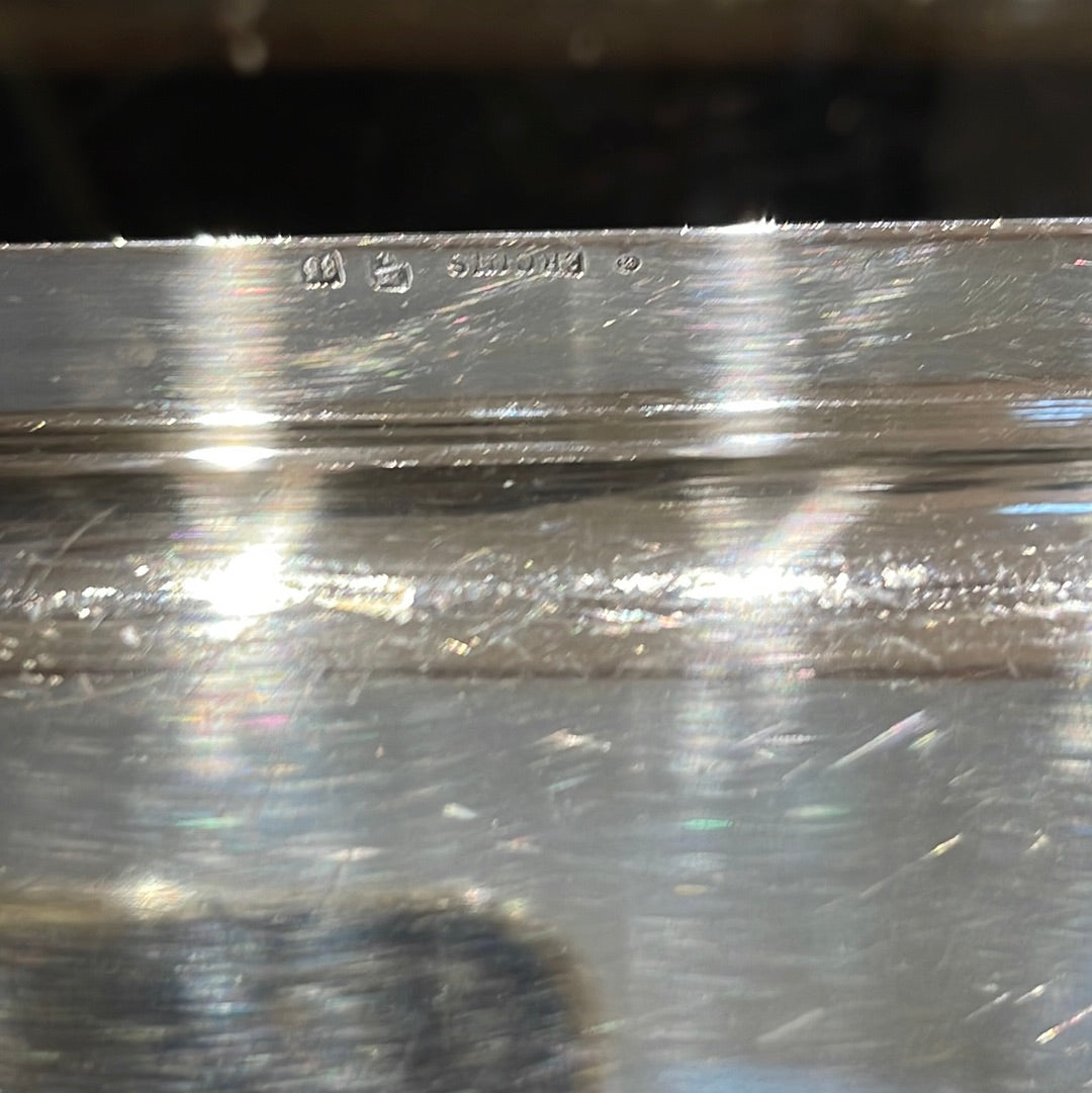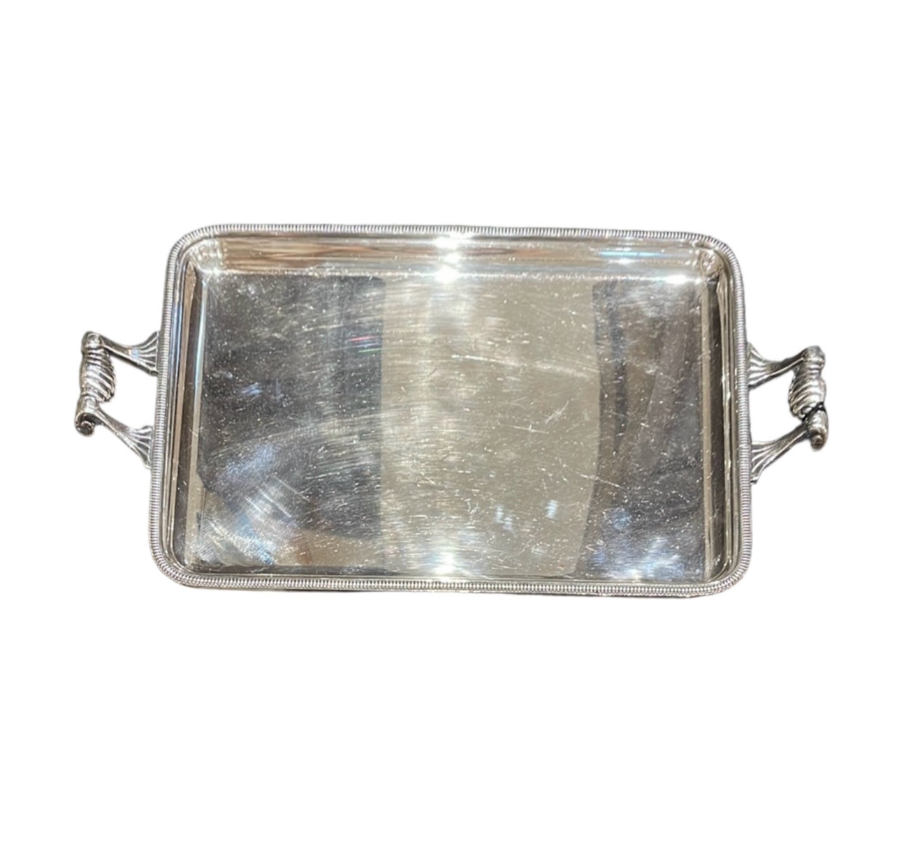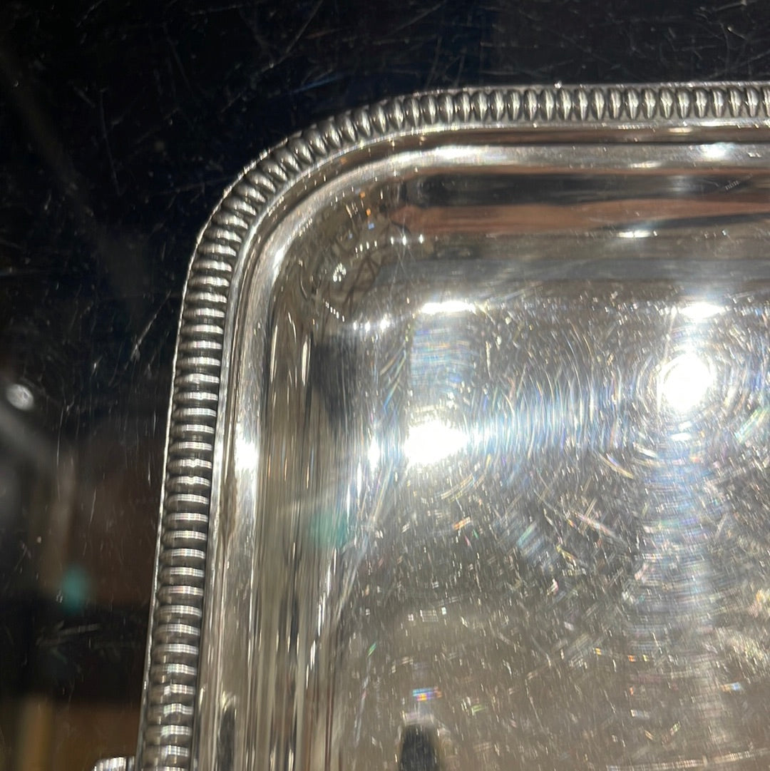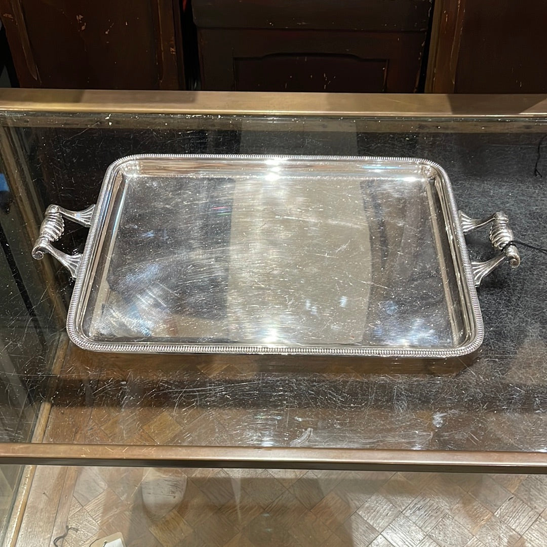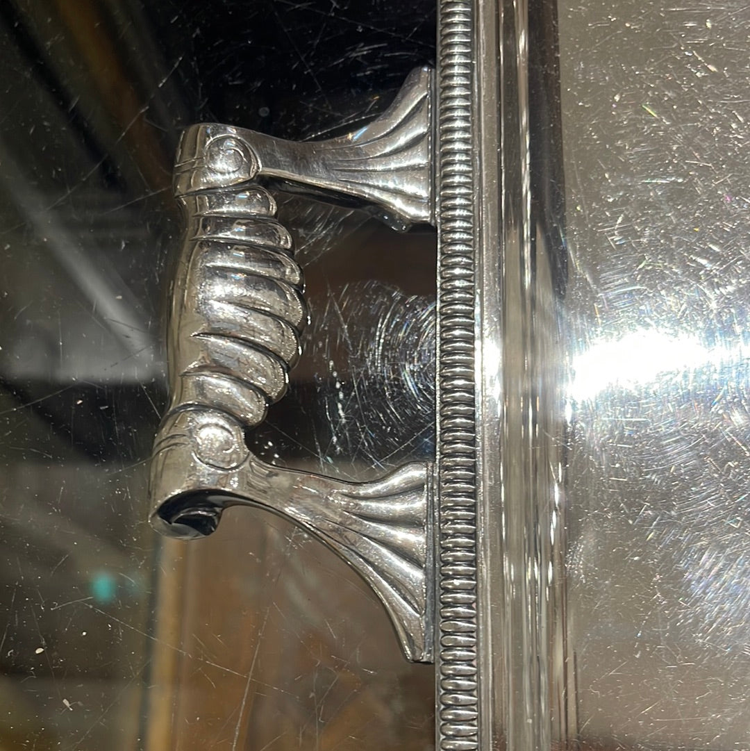 Indulge in luxury with the Silver Plate Tray with Handles! This elegant tray features a stunning silver plated design and convenient handles for easy serving. Impress your guests and elevate any occasion with this stylish and practical addition to your serveware collection.