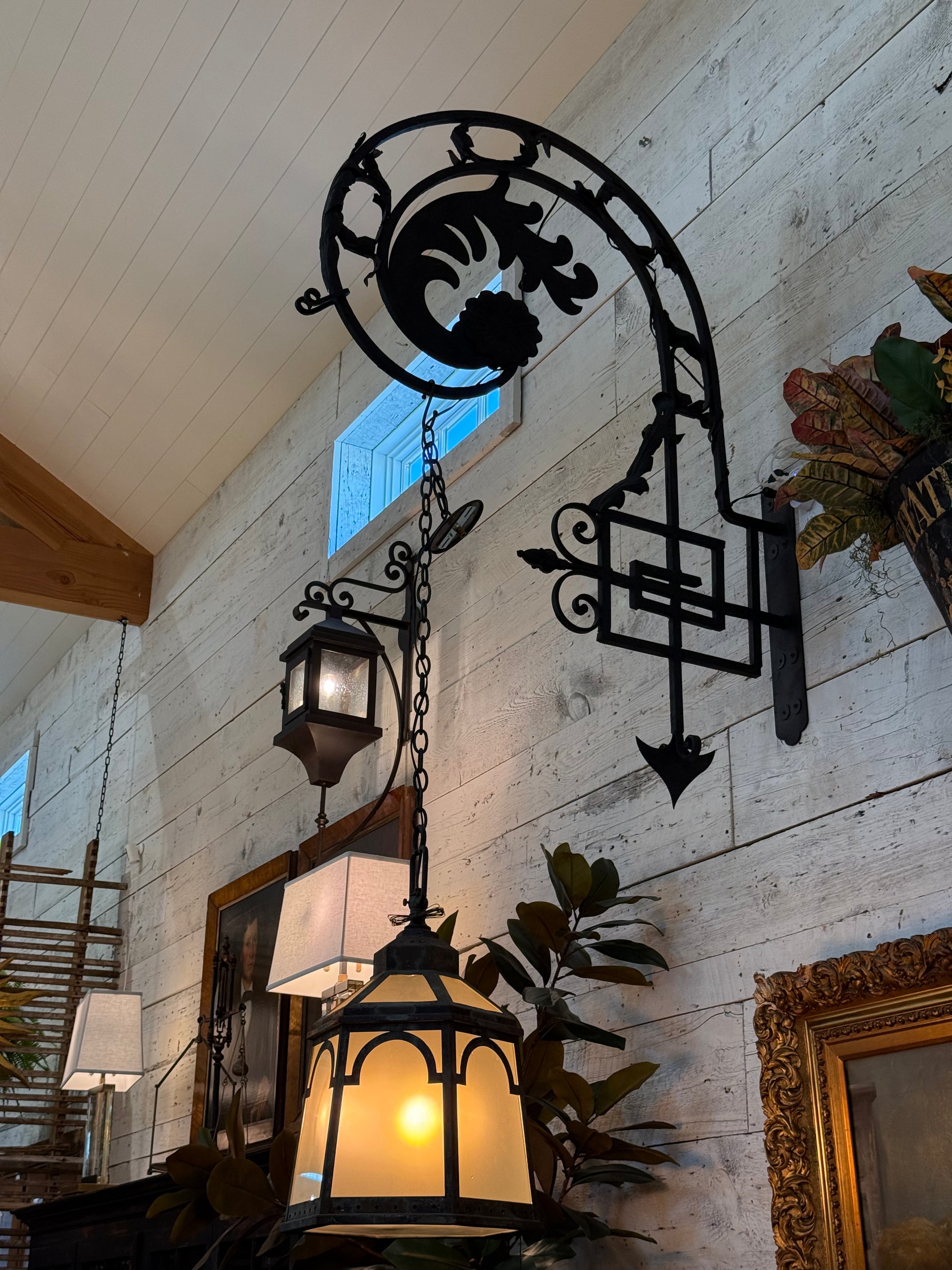 An exceptional 18th-century French fer forge (wrought iron) sign holder of impressive scale and craftsmanship. This architectural treasure features finely hand-forged decorative scrolls, both large and small, and a striking arrow finial. Once embedded into a stone façade by its two horizontal support arms, it would have proudly displayed the signage of a French establishment centuries ago.