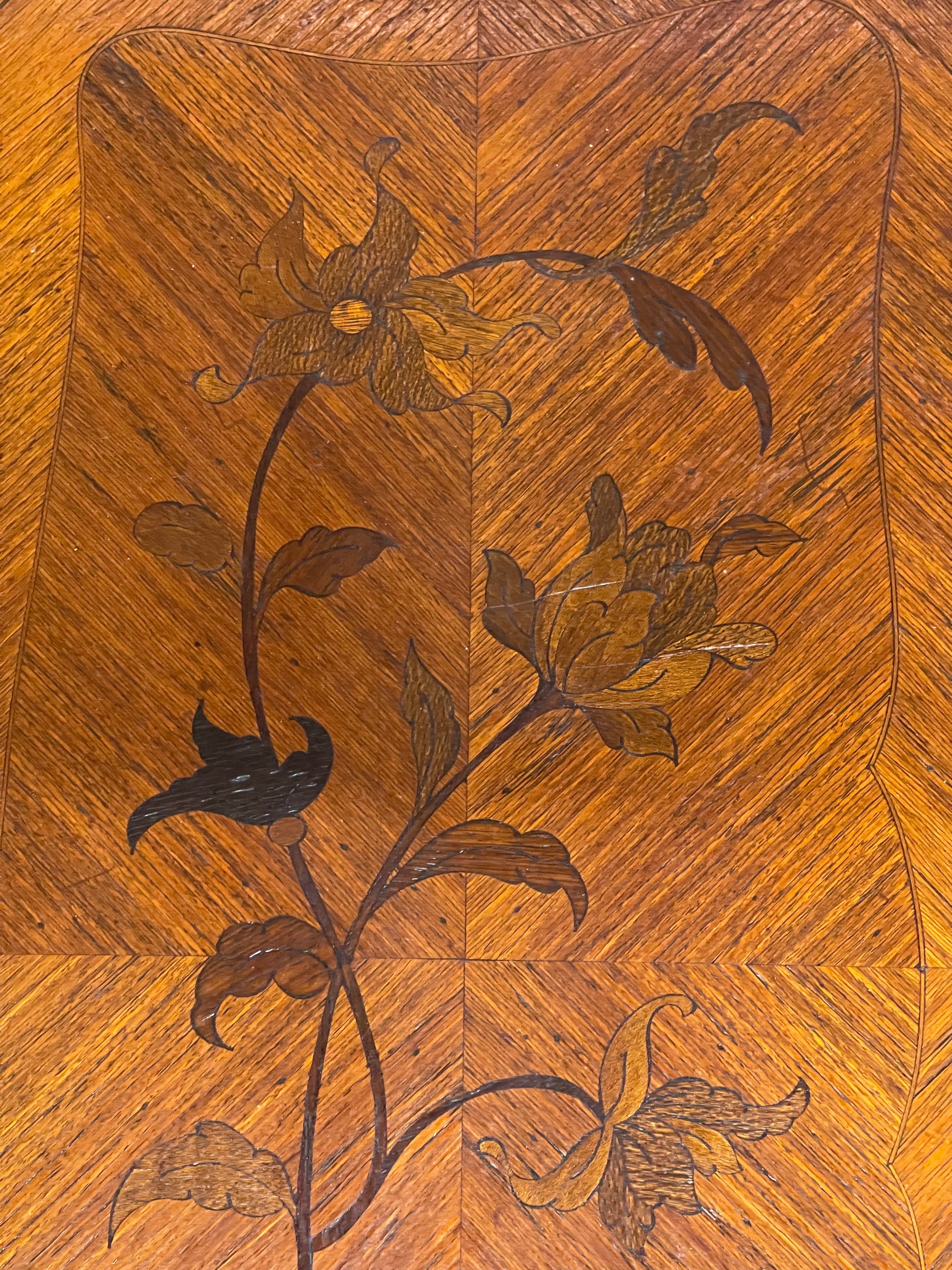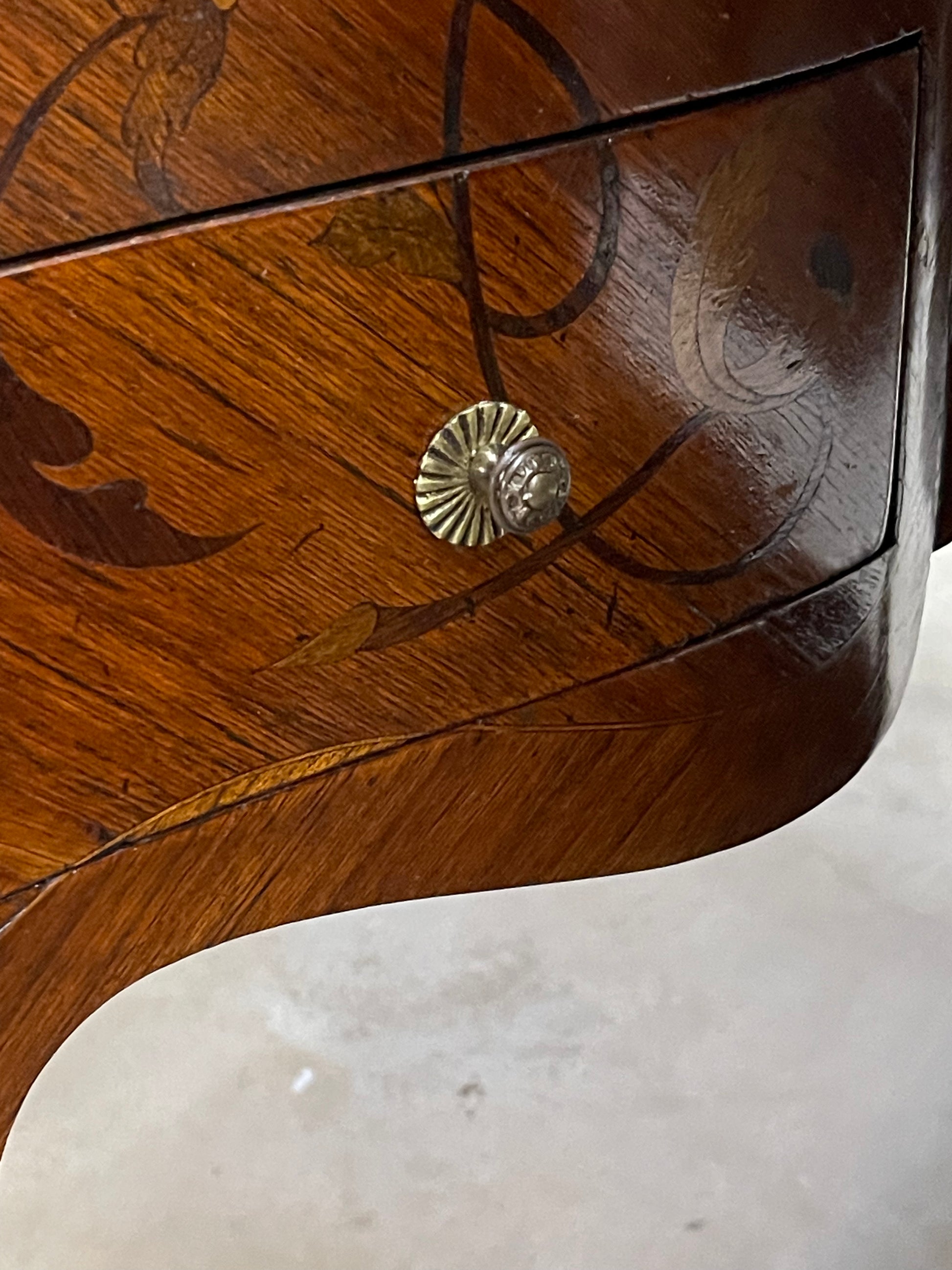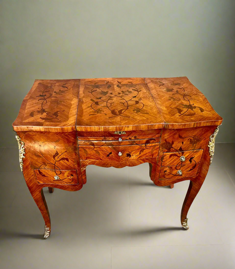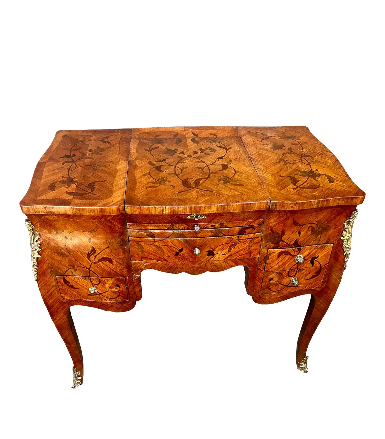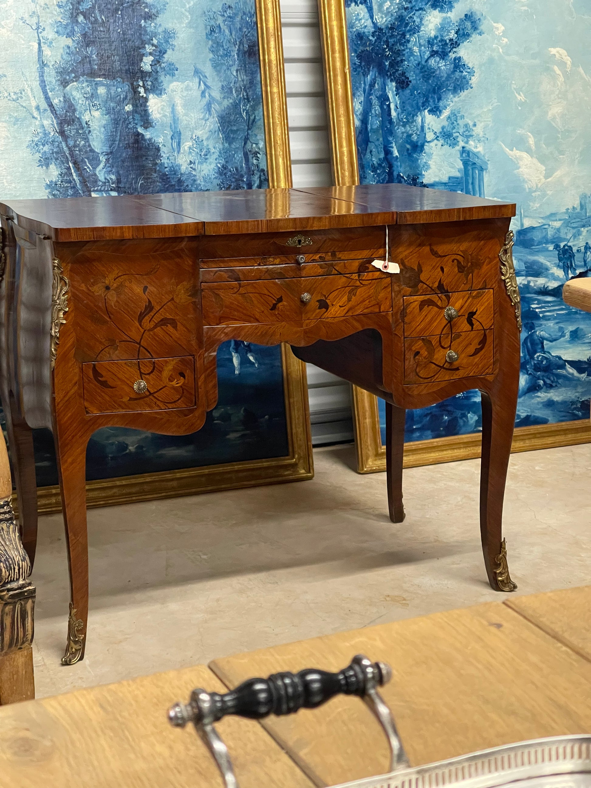 This stunning vanity features a beautifully crafted inlaid walnut design, highlighted with ornate ormolu mounts and a unique bombe style. The lift top provides convenient storage while the kneehole design offers ample legroom. Add a touch of sophistication to your daily beauty routine with this elegant piece! A pretty tulipwood parquetry with fruitwood floral marquetry inlay poudreuse. It's original intended use no longer fashionable but popular by the bed , between chairs or windows as a small chest or table with ample storage.