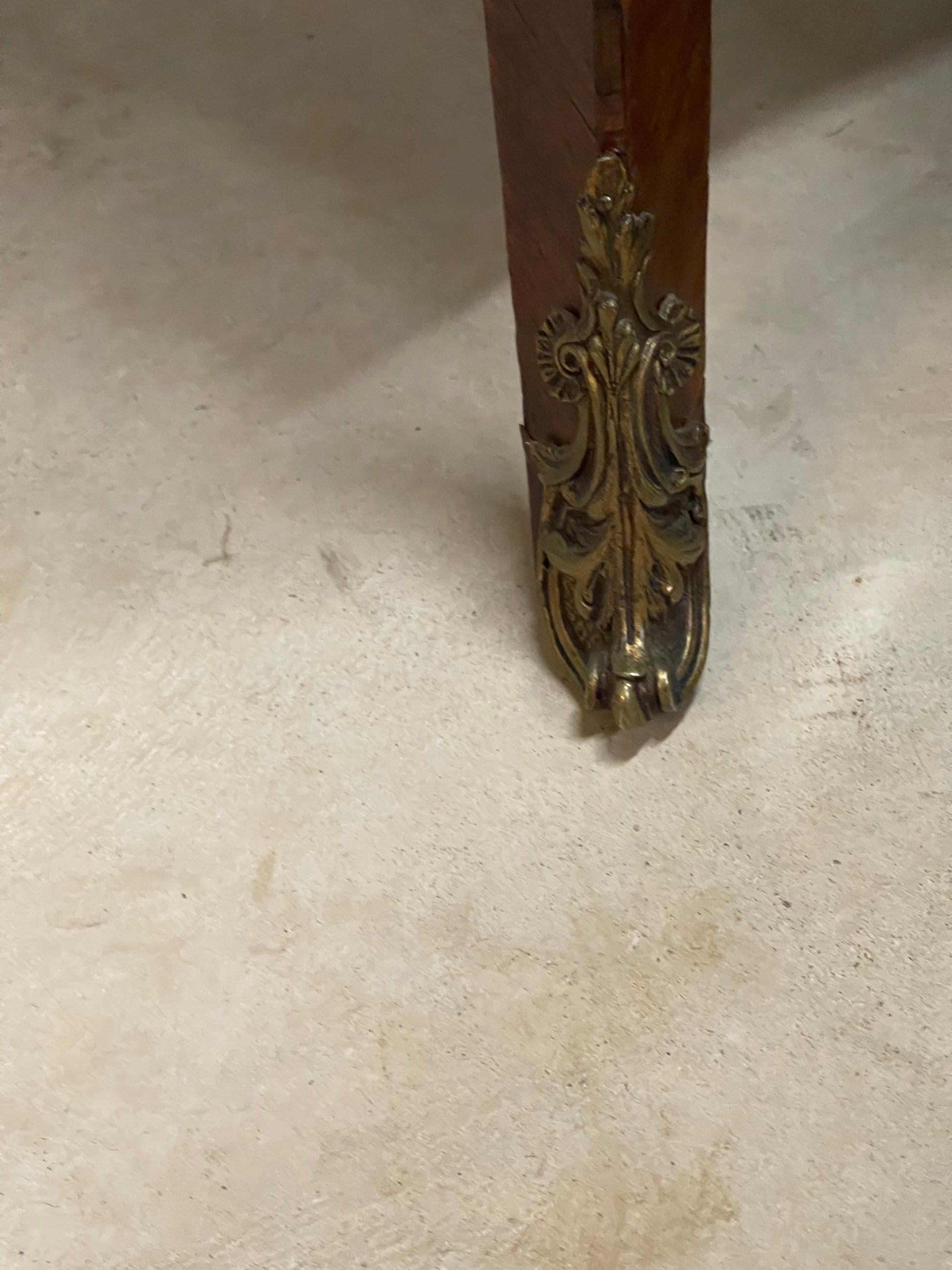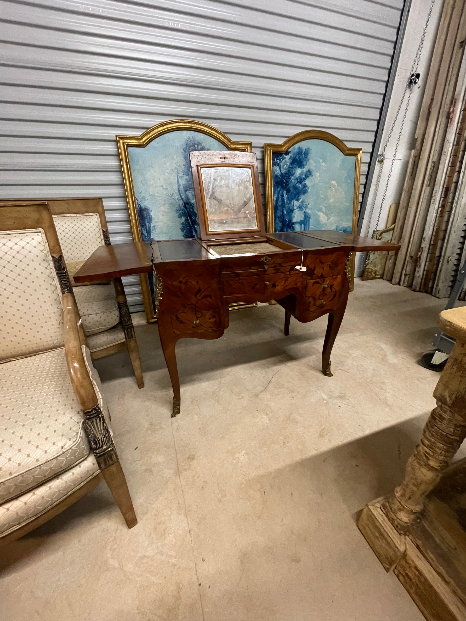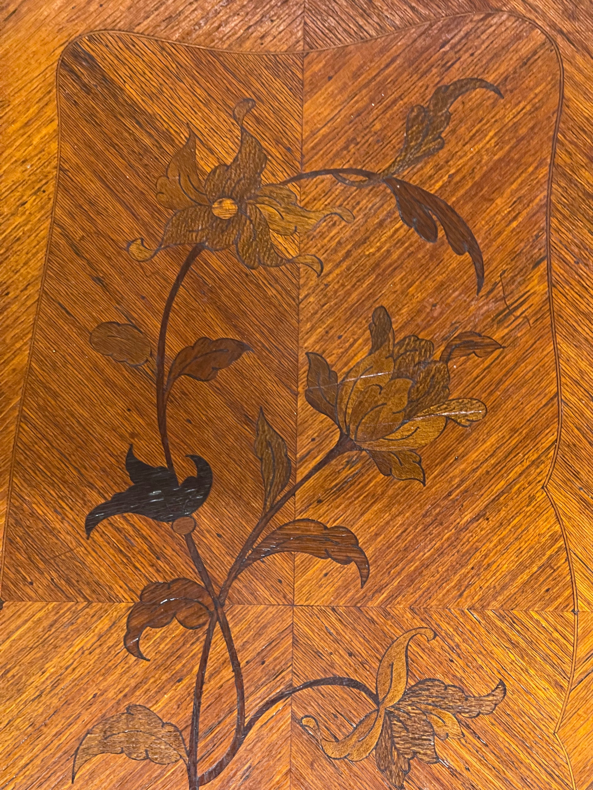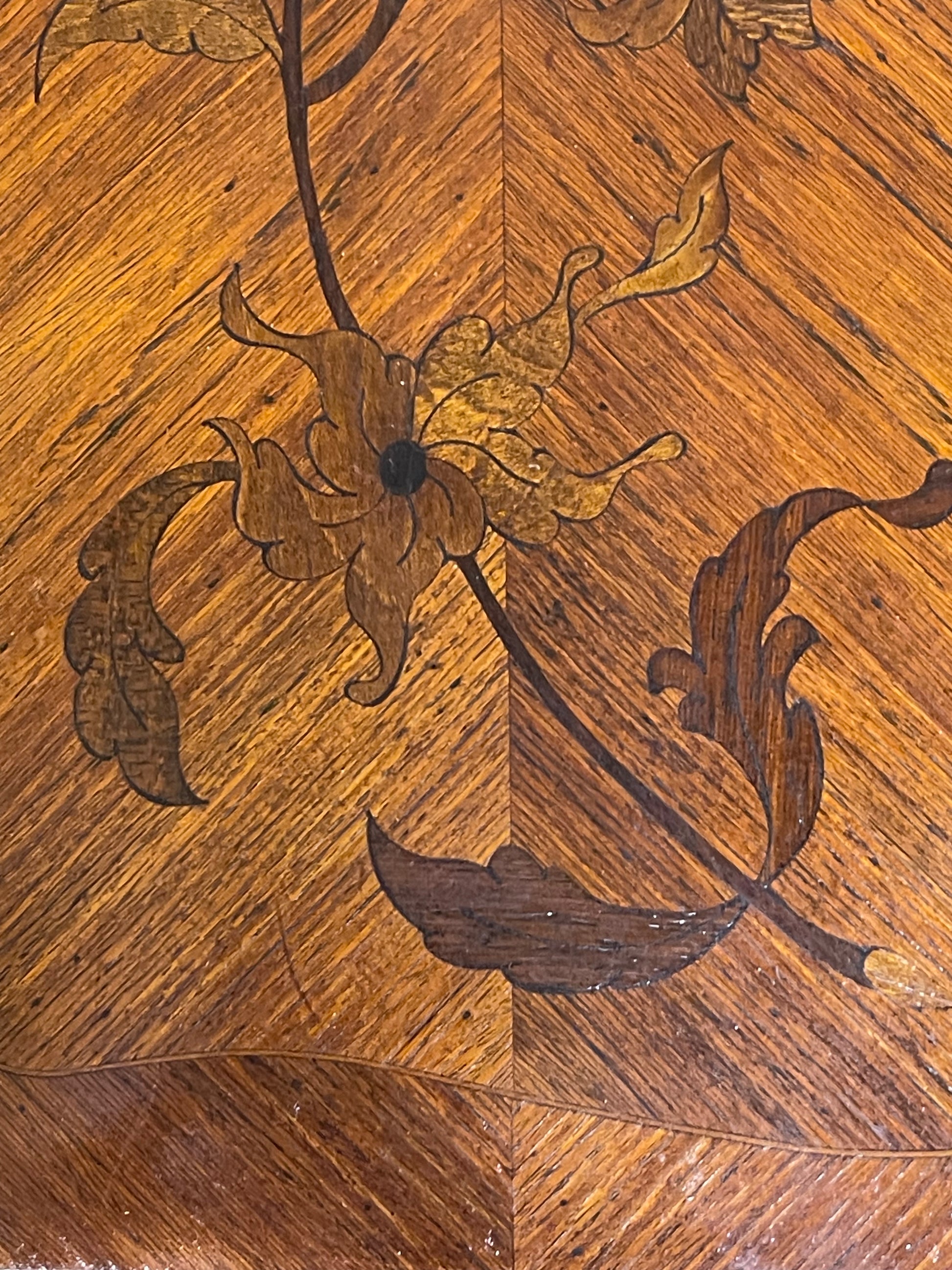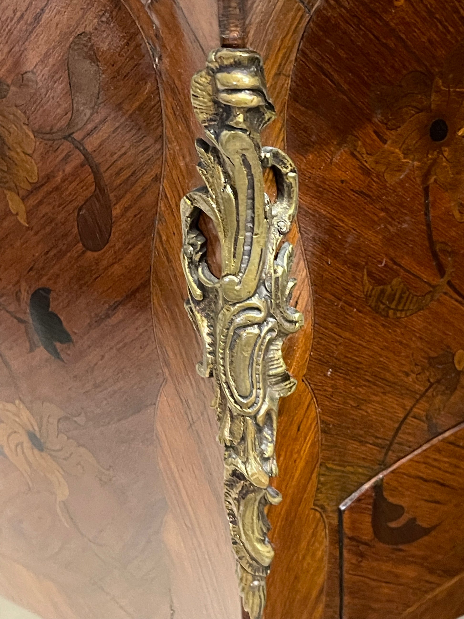 This stunning vanity features a beautifully crafted inlaid walnut design, highlighted with ornate ormolu mounts and a unique bombe style. The lift top provides convenient storage while the kneehole design offers ample legroom. Add a touch of sophistication to your daily beauty routine with this elegant piece! A pretty tulipwood parquetry with fruitwood floral marquetry inlay poudreuse. It's original intended use no longer fashionable but popular by the bed , between chairs or windows as a small chest or table with ample storage.