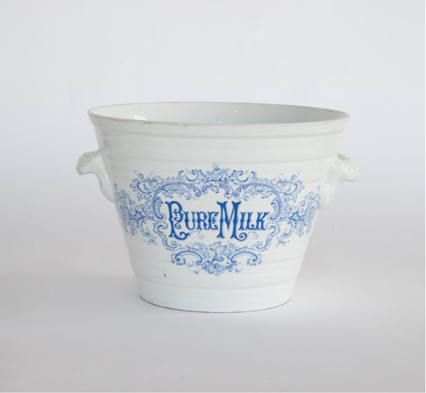The base of the pail has molded bands/ribbing indicative of barrel staves, a motif sometimes seen on foot baths and pitchers. Nicely molded handles are applied to each side of the pail. Pure Milk pails were used commercially in grocery stores or dairies to hold milk that had been separated from the cream, with another nearby pail holding the cream. Other commercial pieces labeled "New Milk" contained milk prior to cream separation. During the 1800s, other commercial items such as Pure Butter, Margarine, Butter, and unlabeled slabs were also present. These pieces were quite special even in their time.