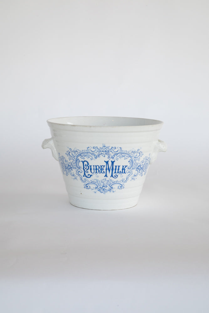 This stunning blue and white piece is perfect whether you are a collector of grocer/dairy ironstone or an advanced collector seeking something special. Measuring 13" in diameter and 9.5" high, it is smaller than most pails. "Pure Milk" pails rarely surface, and those that do are usually larger. This particular pail stands out not only due to its smaller size but also because of its exceptional condition. The transfer is clean and detailed, although it does not feature an image of a cow, which is uncommon for such pails. The words "Pure Milk" are boldly printed in block letters, maintaining clarity and sharpness.