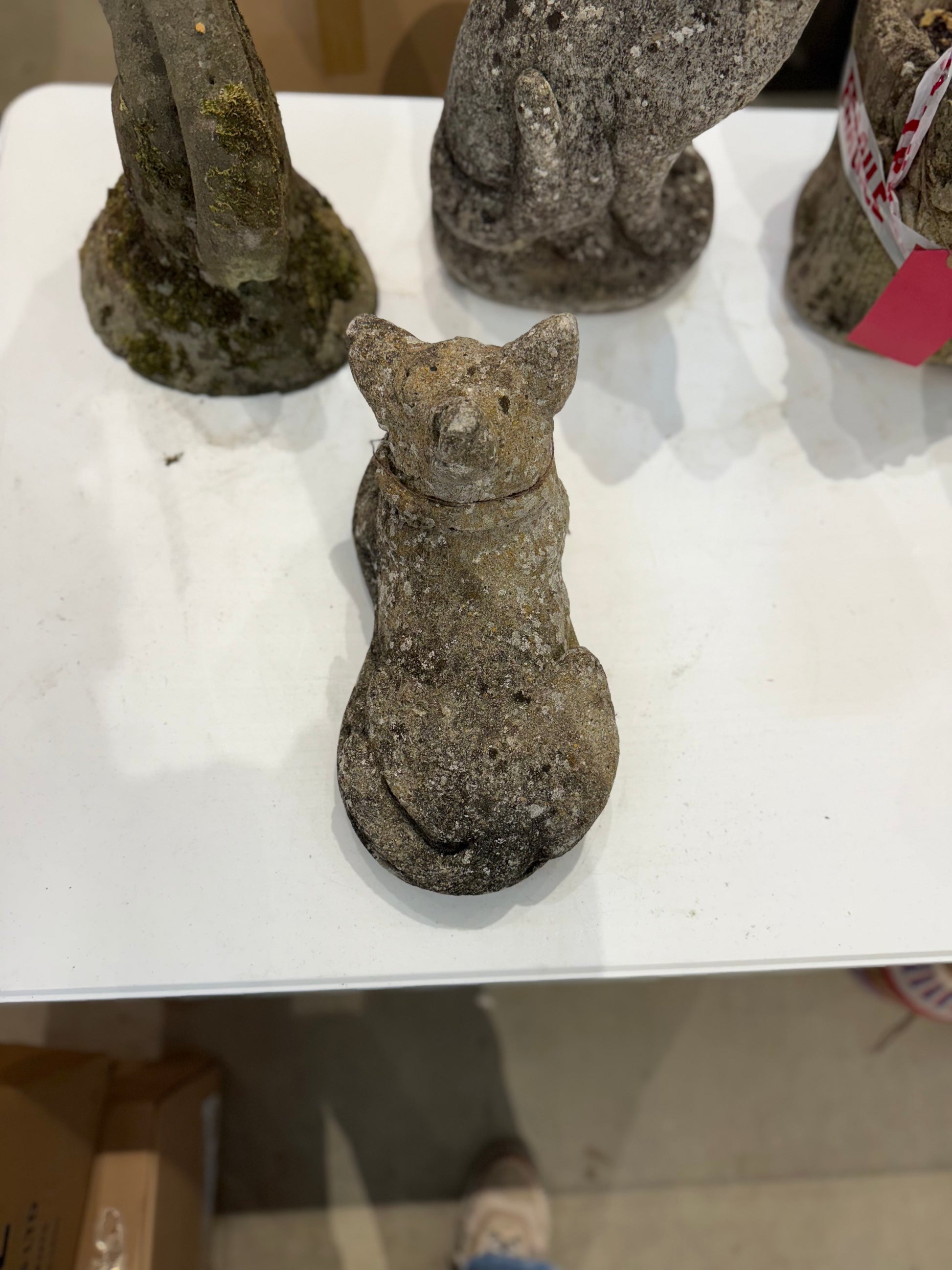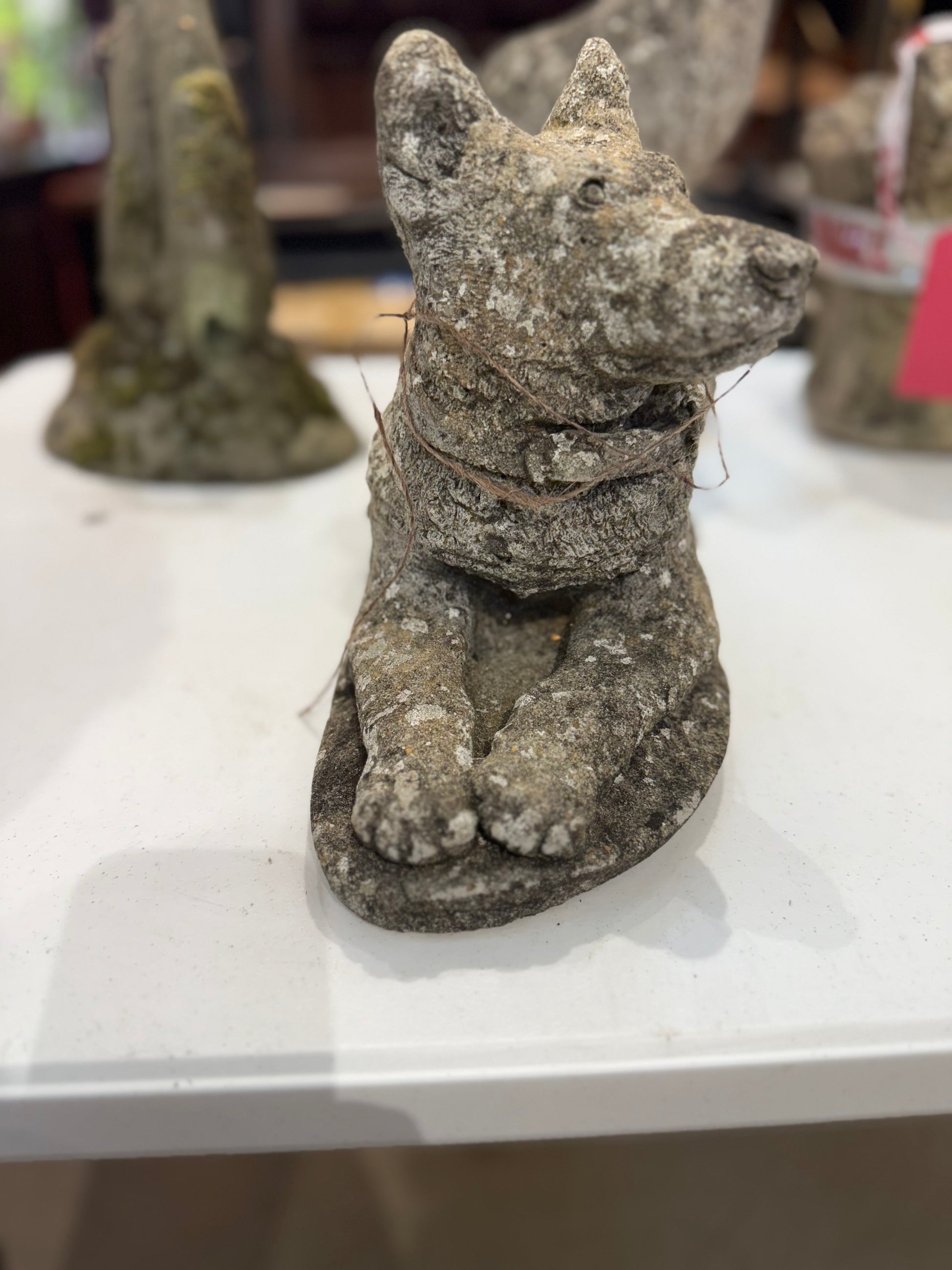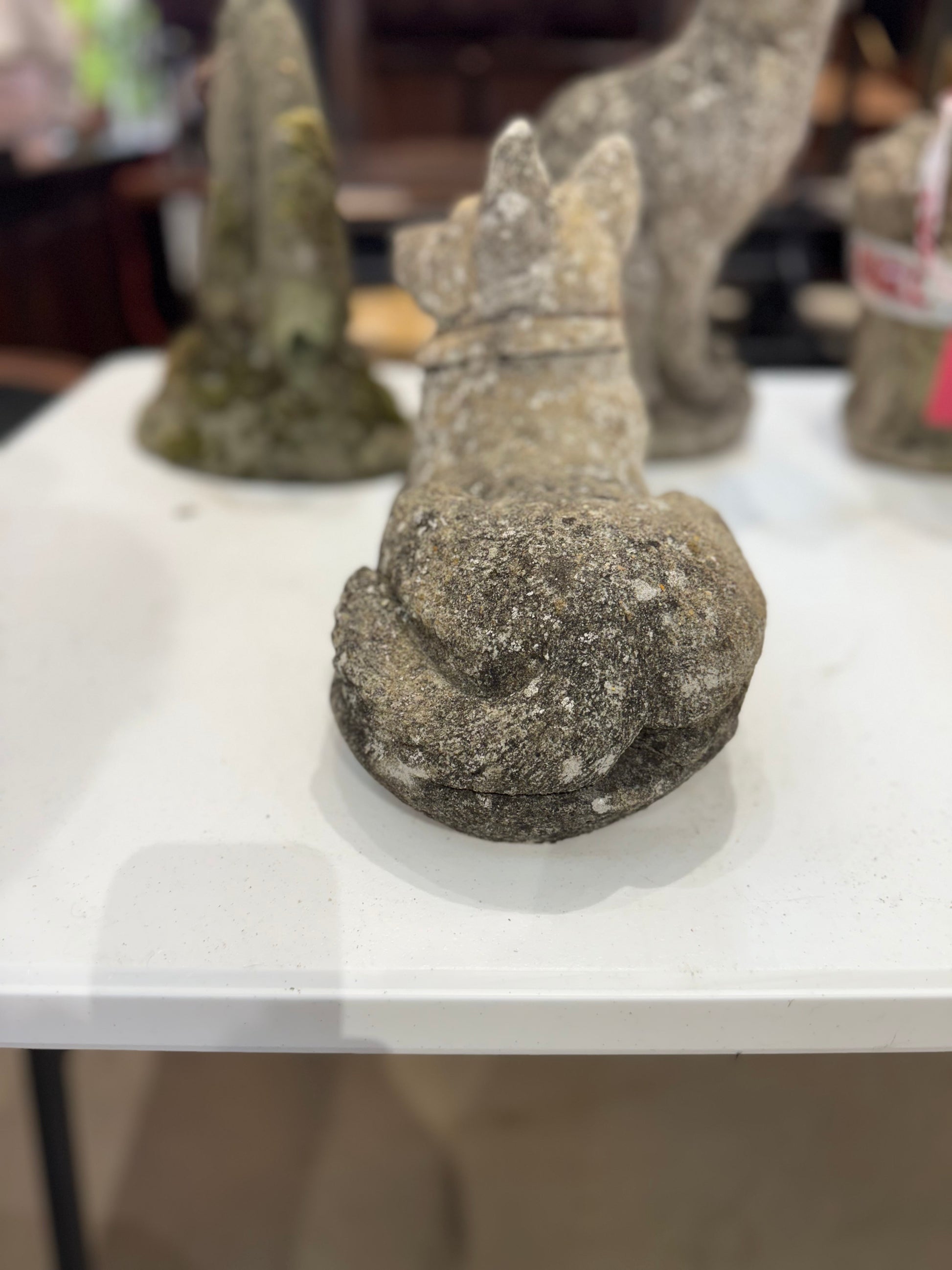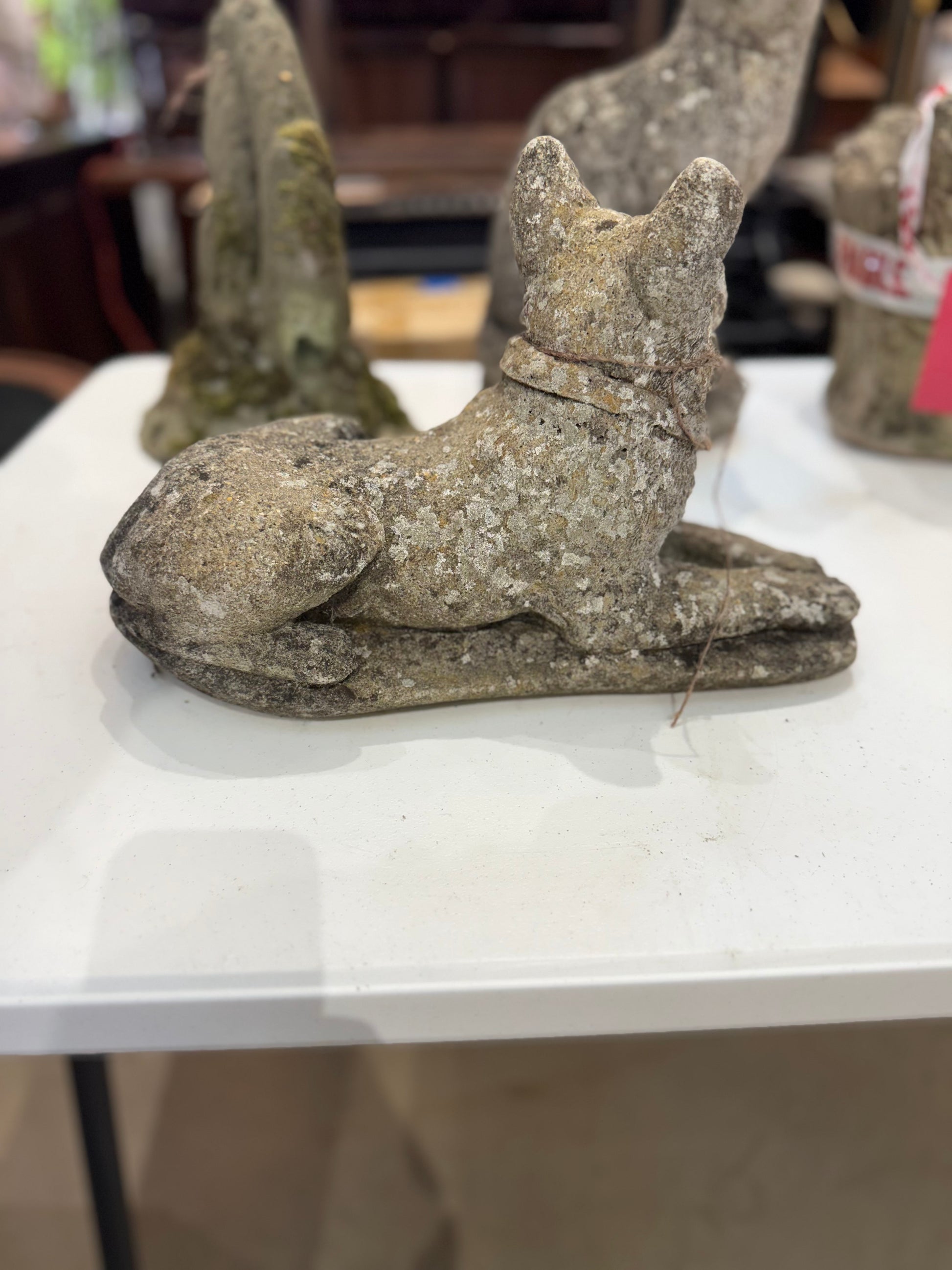 This charming stone dog sculpture captures a serene moment with its relaxed posture and attentive, perky ears. Perfect for adding a touch of timeless elegance and warmth to your garden or home decor, it blends natural stone durability with artistic detail. Elevate your space with this inviting piece that combines tranquility and character effortlessly.